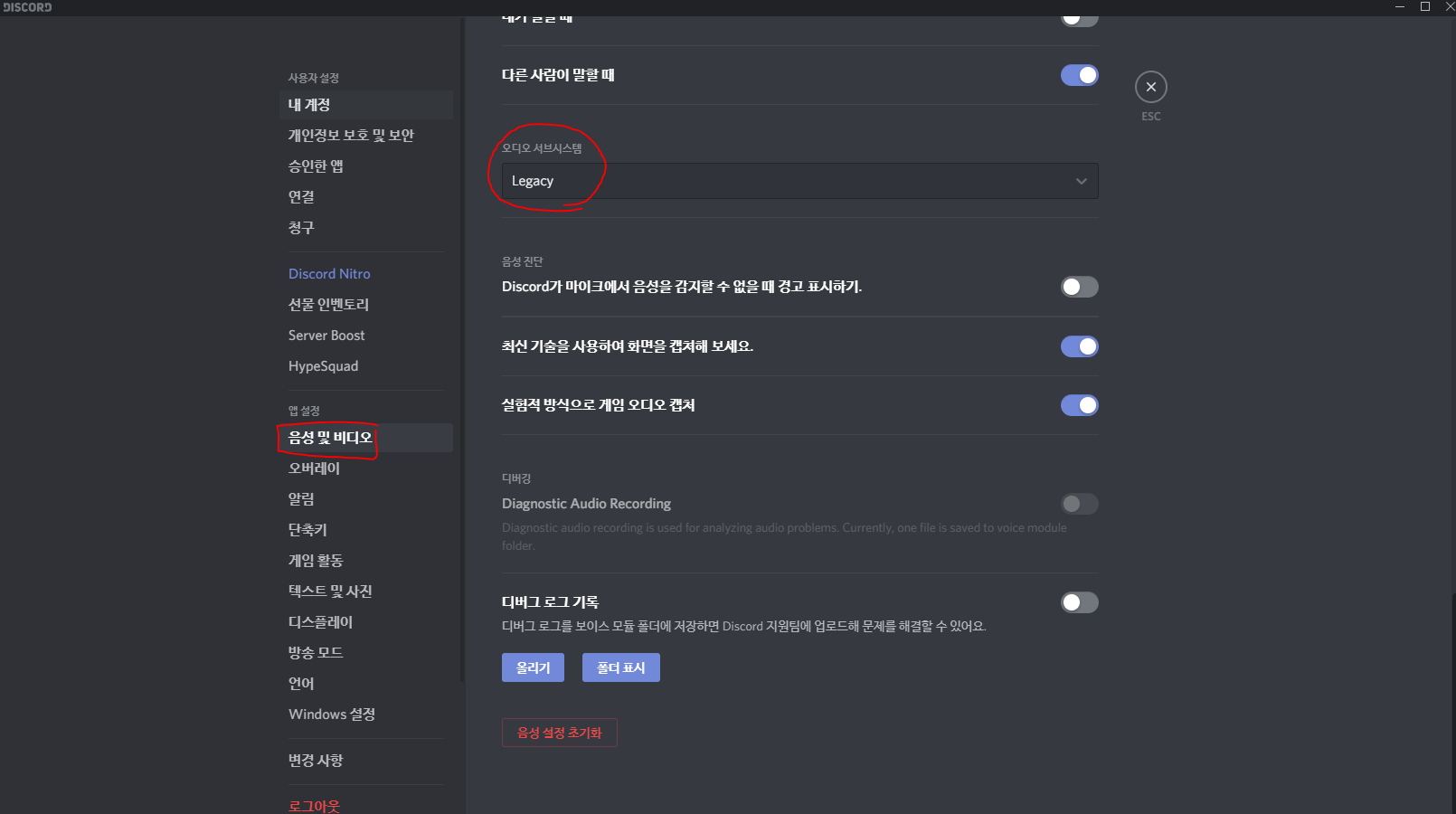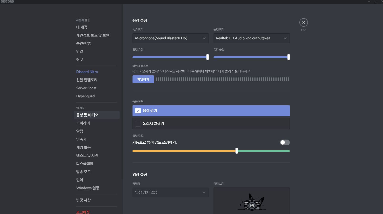 설정 -> 음성 및 비디오탭에 들어가서 마이크 / 스피커가 정상적으로 설정되었는지 확인 후 디스코드를 껐다 켭니다.