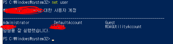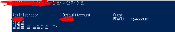 이 명령어는 사용자의 계정들을 보여줍니다. Guest, Administrator, DefaultAccount, WDAGUtilityAccount는 기본적으로 Windows에서 사용하는 계정들이니 안심하세요.