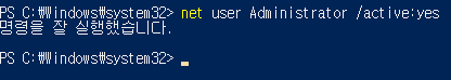 net user Administrator /active:yes 를 치고 엔터하시면, 명령을 잘 실행했습니다와 함께, 관리자 권한 계정인 Windows의 Administrator 계정이 활성화됩니다.