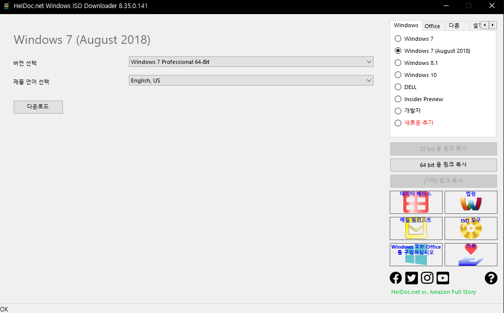 시험삼아 윈도우 7을 받아보겠습니다. 다운로드 버튼을 누르세요.