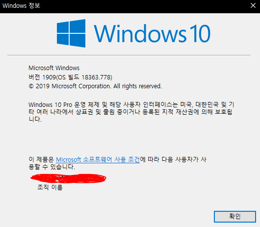 제일 상단의 버전 1909(OS 빌드 18363.778) 이라 써진 부분에서, 1909 써진 부분이 빌드번호입니다.
