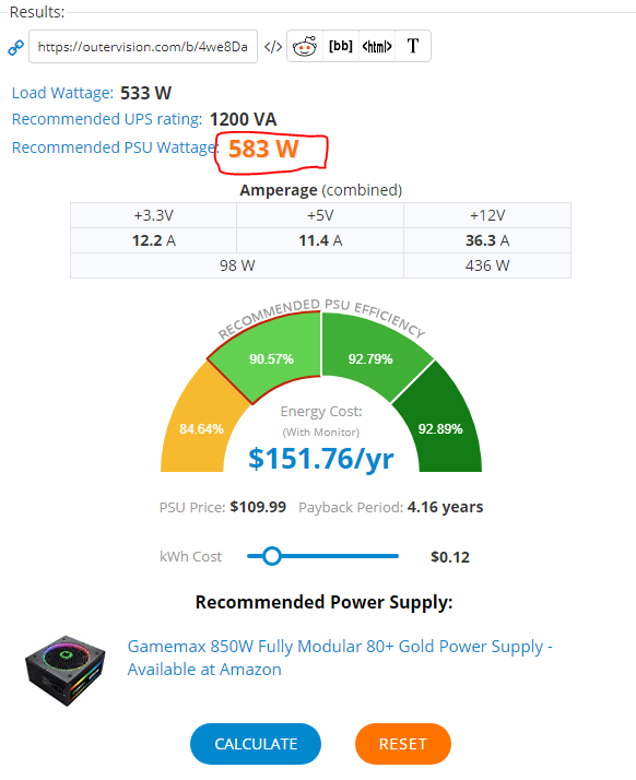 Copy and paste the following markup into your post: [url=https://outervision.com/b/4we8Da]OuterVision PSU Calculator part list[/url] [b]Motherboard:[/b] Desktop [b]Socket:[/b] Socket AM4 [b]CPU:[/b] 1 x AMD Ryzen 7 3800X [b]CPU Speed:[/b] 4300MHz [b]CPU Vc