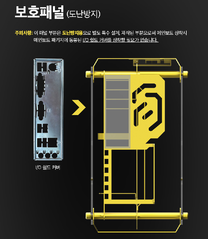메인보드 후면에 지정된곳에, 별도의 고정 지지대와 함께 연결합니다.