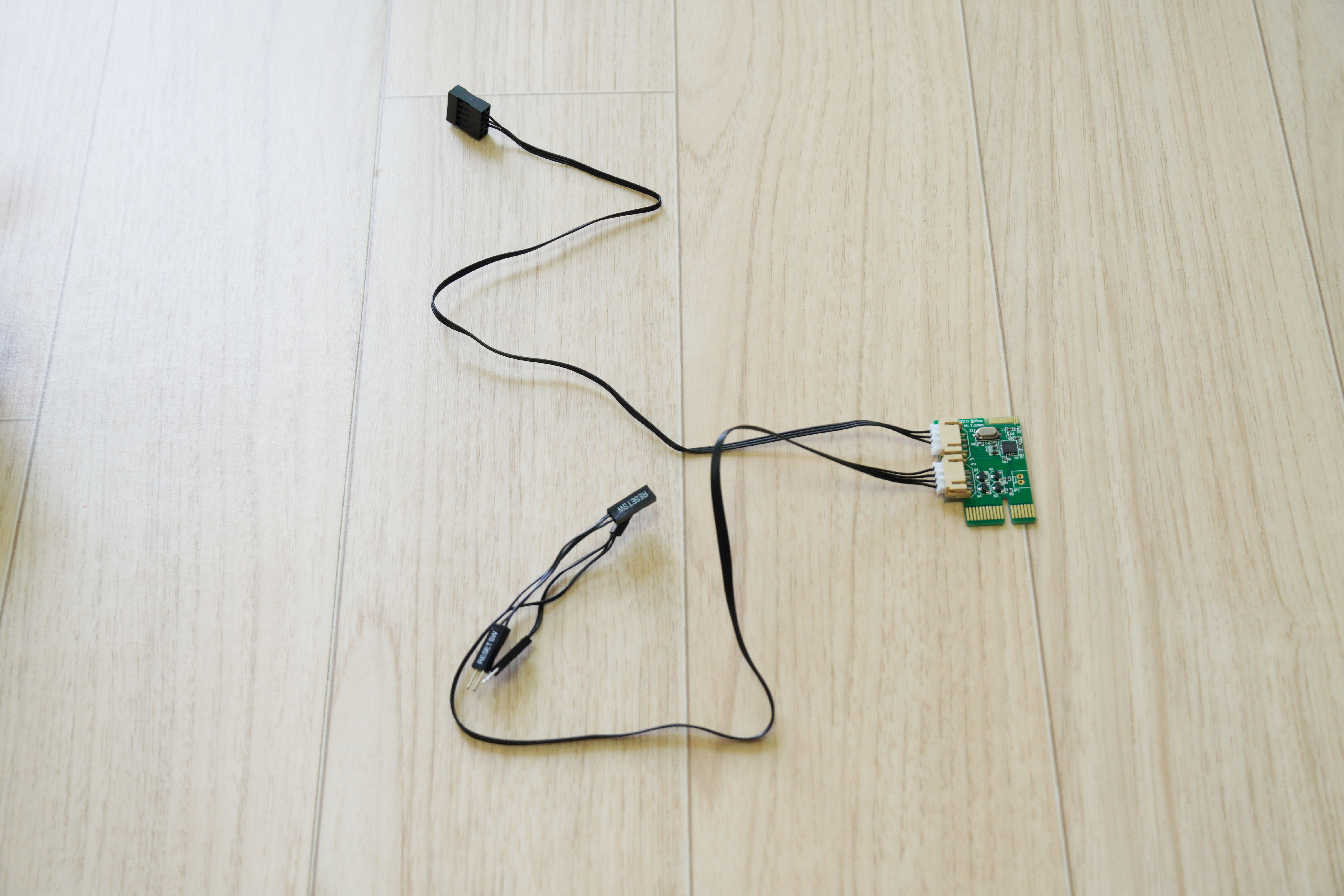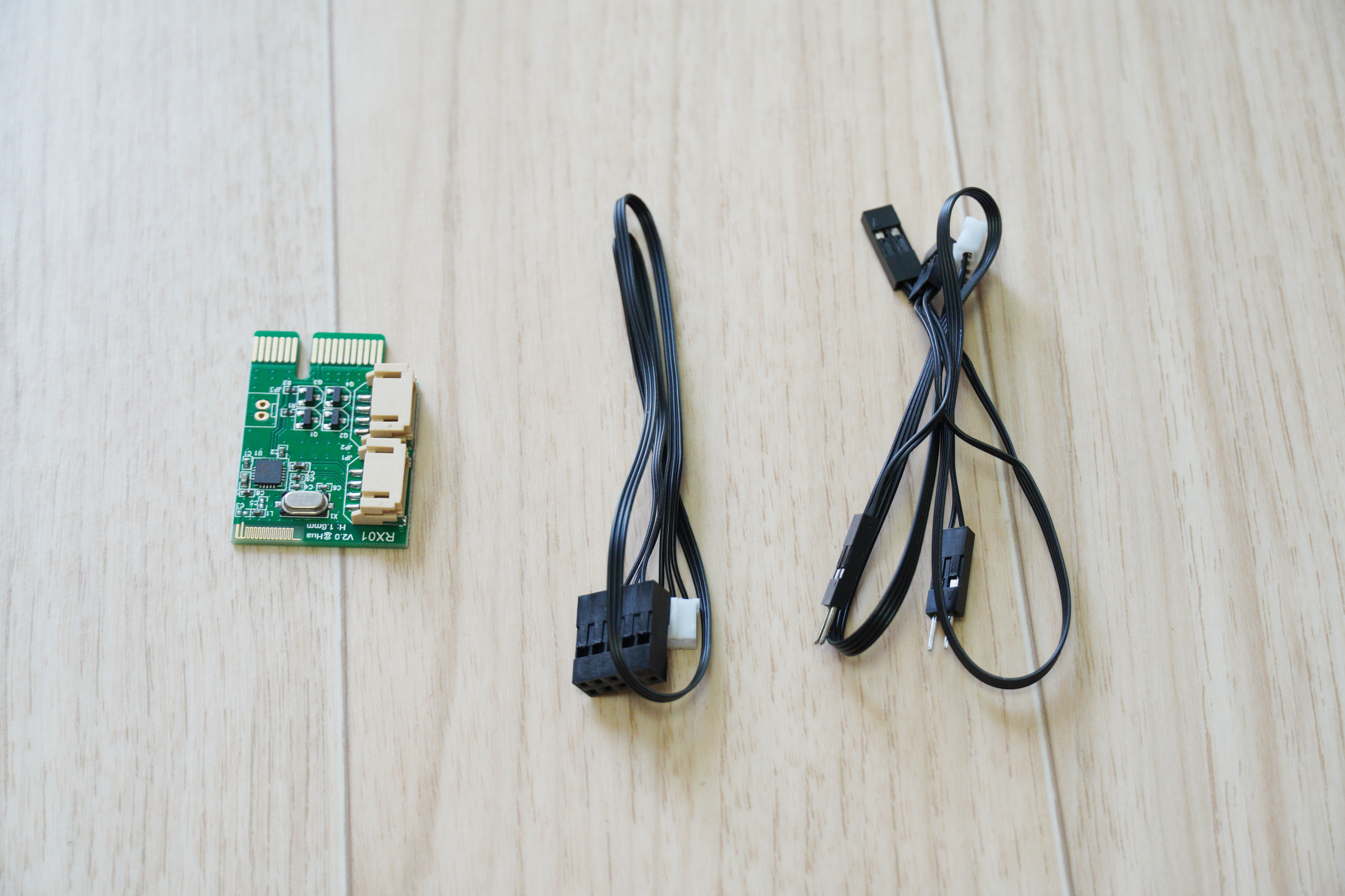 동봉된 칩과 선은 왼쪽부터, PCIE 1배속 슬롯 칩, USB선, 전면패널선입니다.
