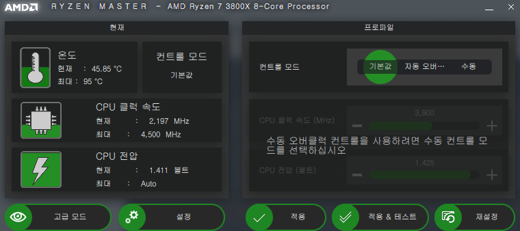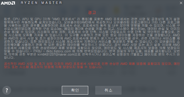 확인버튼을 누르시면 실행되고, 왼쪽의 ? 버튼을 누르실 경우 라이젠마스터가 PC의 이상상태를 판단, 자동으로 프로세서의 모든 값들을 초기상태로 되돌리고 실행시킵니다.