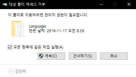 시스템폴더라 관리자권한을 요구하는데, 계속 버튼 눌러서 진행하시면 됩니다.