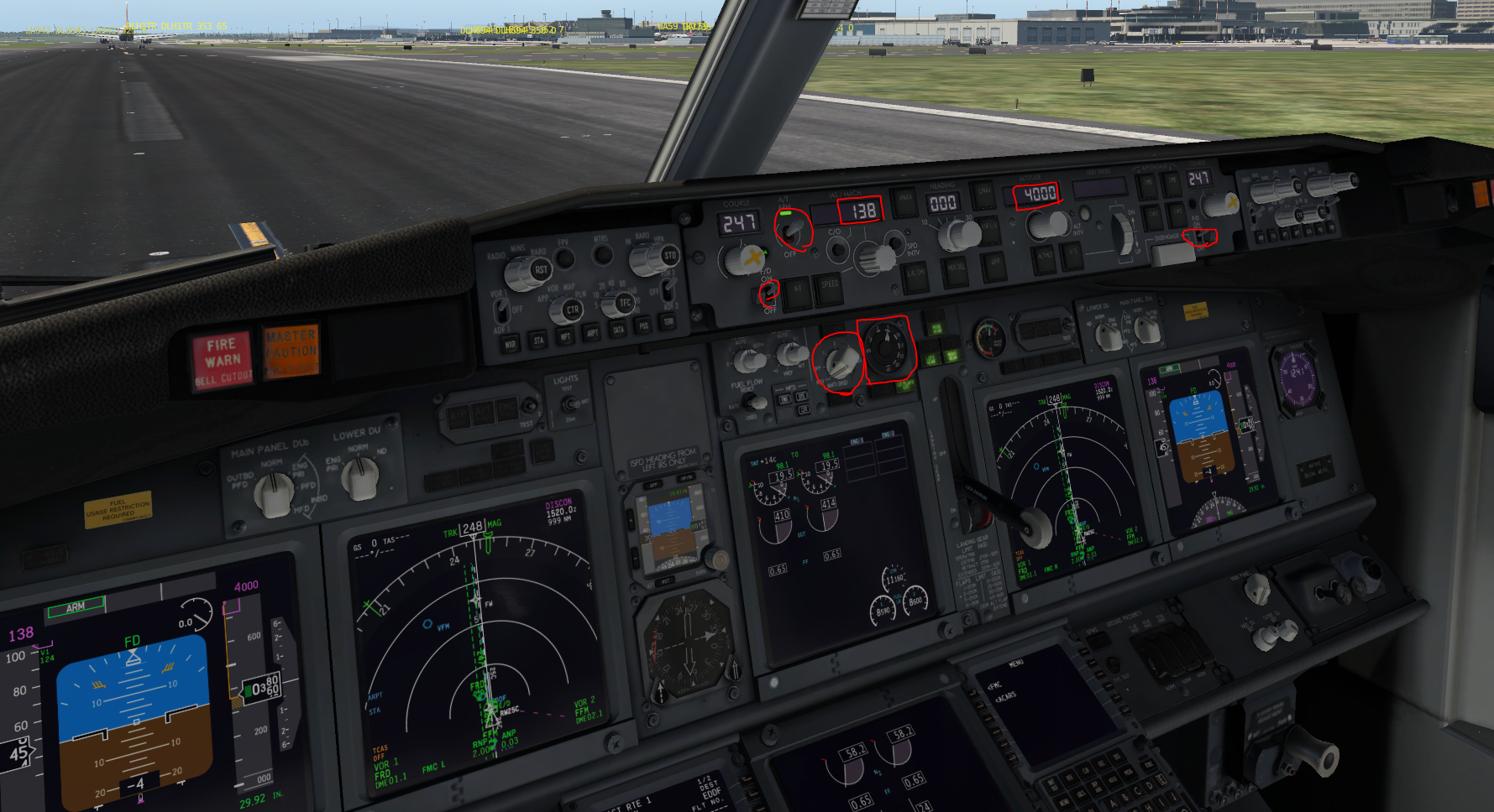 마지막으로 이륙 전, F/D(Flight Director) 가 켜져있는지, A/T ARM(Autothrottle ARM)이 켜져 있는지, 속도는 V2 속도에 맞춰져 있는지, 고도가 맞춰져 있는지, 플랩은 제 위치에 가 있는지, Autobrake는 RTO로 되어 있는지 확인합니다.