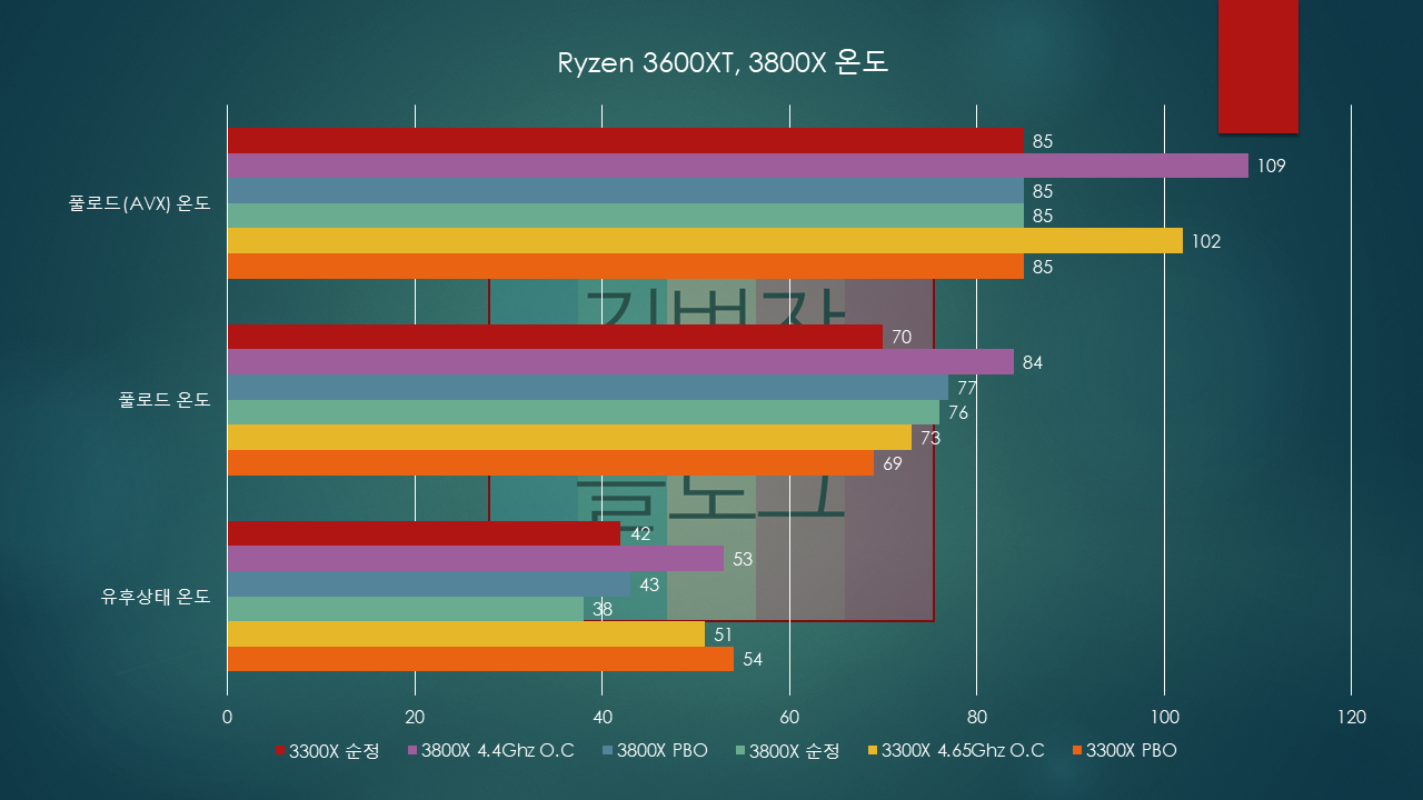 오버클럭의 경우, 3600XT는 4.65Ghz에 1.4v로 안정화를 보았고, 3800X의 경우 4.4Ghz에 1.4v로 안정화를 보았습니다.