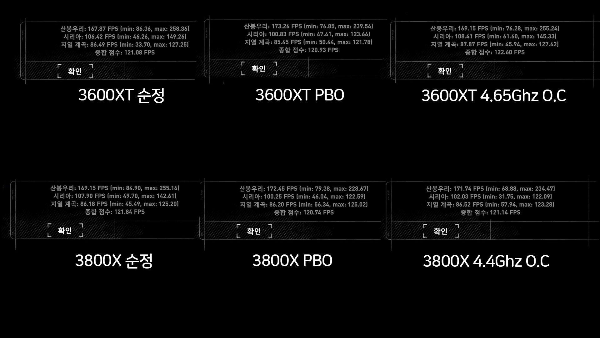 그러나 최소프레임을 보았을때, PBO를 켤 경우 각 프로세서의 최소프레임값이 동일해지는 현상을 볼 수 있습니다.