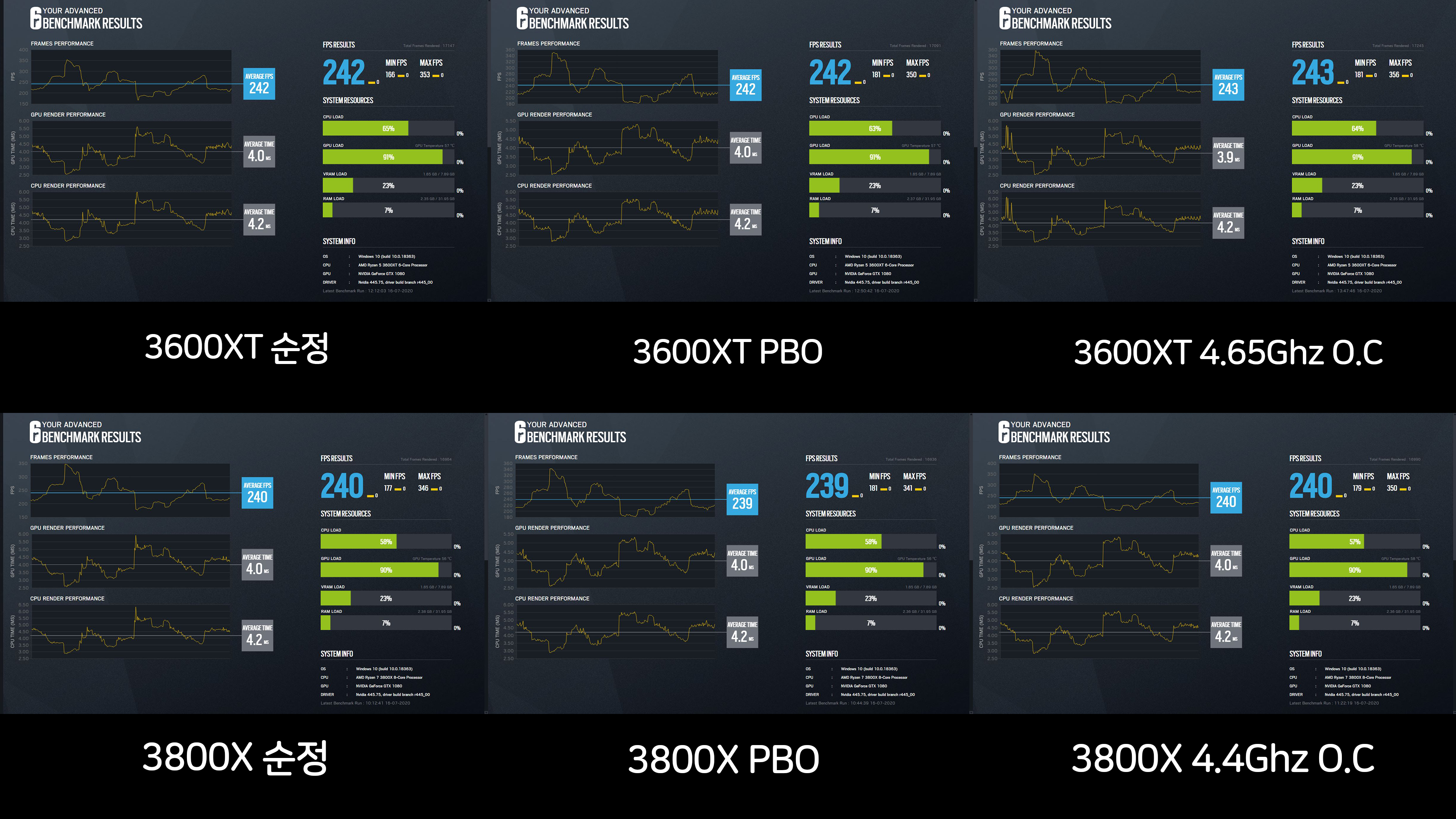 그리고, 3600XT의 비약적인 클럭 향상이 게임에 긍정적인 영향을 준다고 볼 수 있습니다. 이는 벤치마크 결과를 볼 때 PBO를 켰을 경우 3800X보다 더 높은 프레임을 보이기 때문입니다.