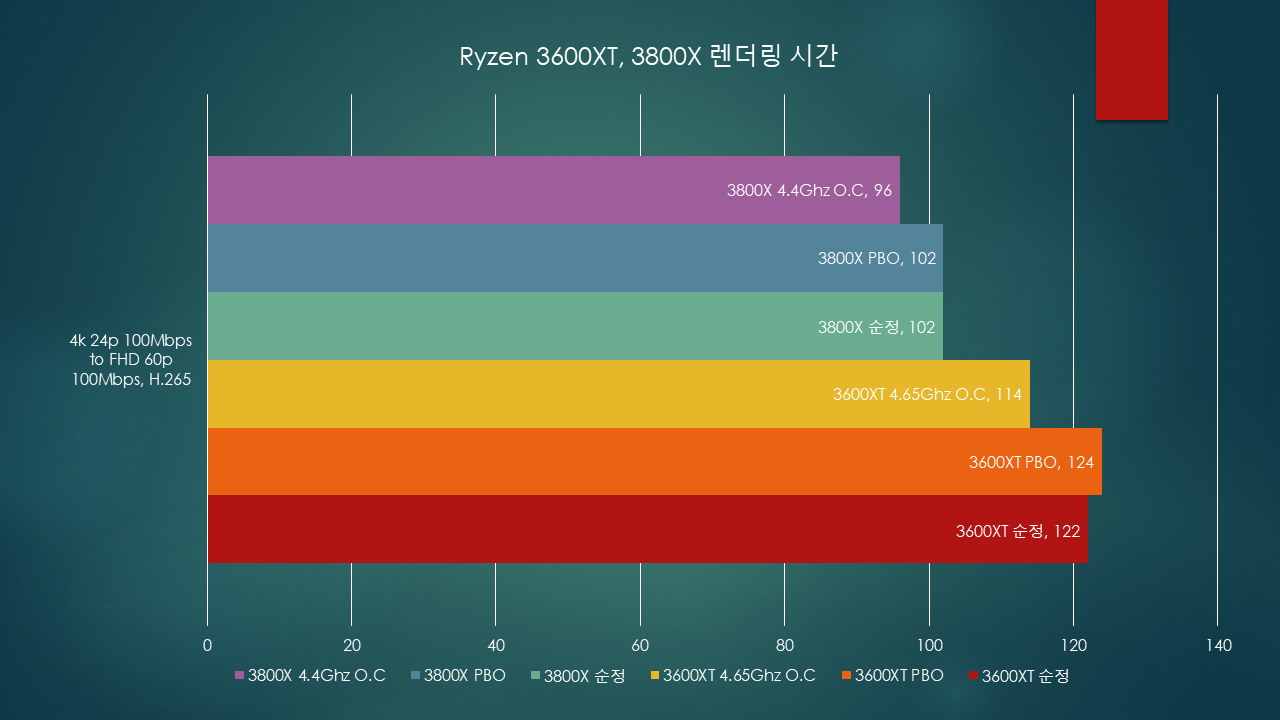 당연히 코어가 많은 3800X가 더 빠르고, 역시 이전 테스트와 비슷하게 PBO를 켰을때 약간의 성능 하락이, 수동오버클럭을 했을 때 어느정도 성능 향상이 보였습니다.