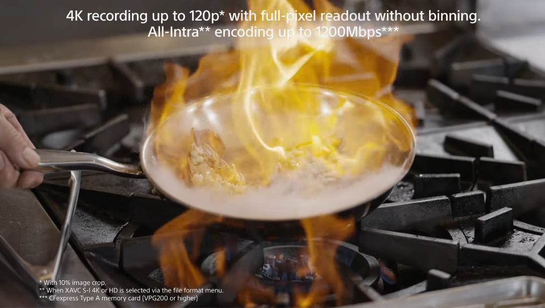 최대 4k 120fps 4:2:2를 내장으로 지원, 풀픽셀 리드아웃이며 픽셀비닝이 없습니다. 1200Mbps입니다. CF Type-A 카드를요구합니다.