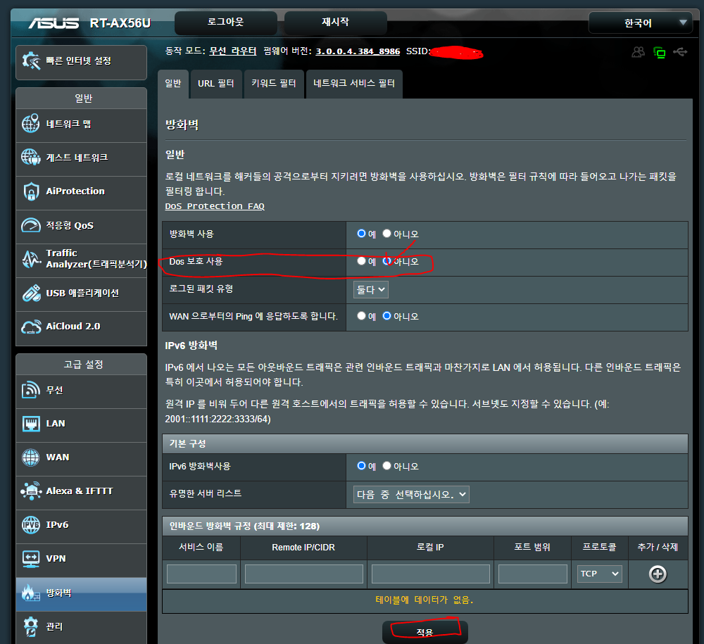 이후 로그인 하신 뒤, 왼쪽에 방화벽 탭에 가셔서, Dos 보호 사용을 아니오 를 체크 후 하단 적용 버튼을 누르시면 됩니다.