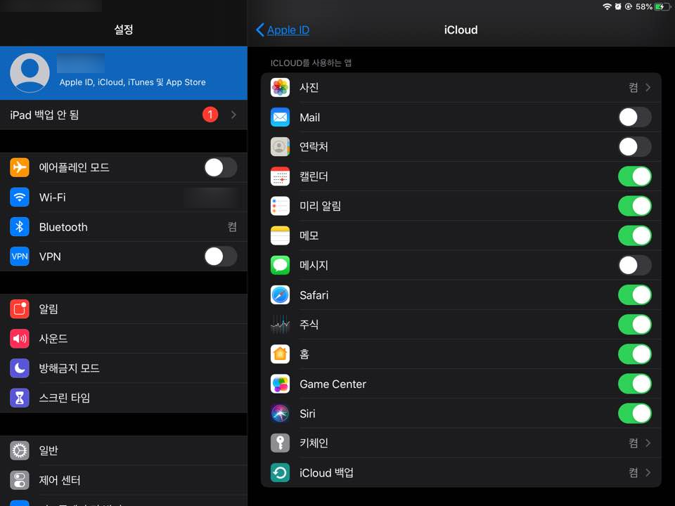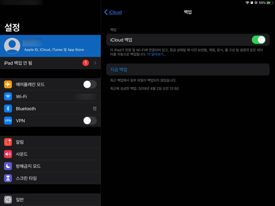 파랑색으로 처리된 저 Apple ID부분을 클릭 -> iCloud -> iCloud를 사용하는 앱 탭에서 iCloud 백업으로 들어갑니다.