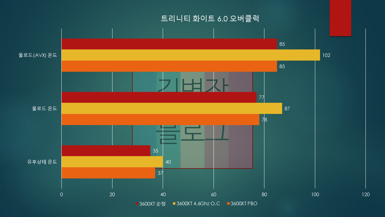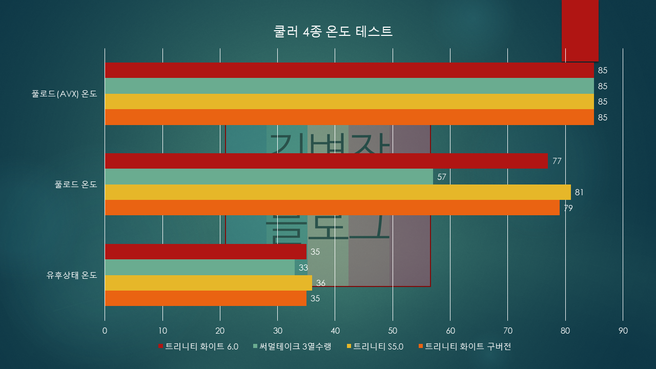아이들 온도는 당연히 일체형수랭이 제일 낮고, 트리니티 시리즈끼리 비슷한 정도를 보여줍니다.