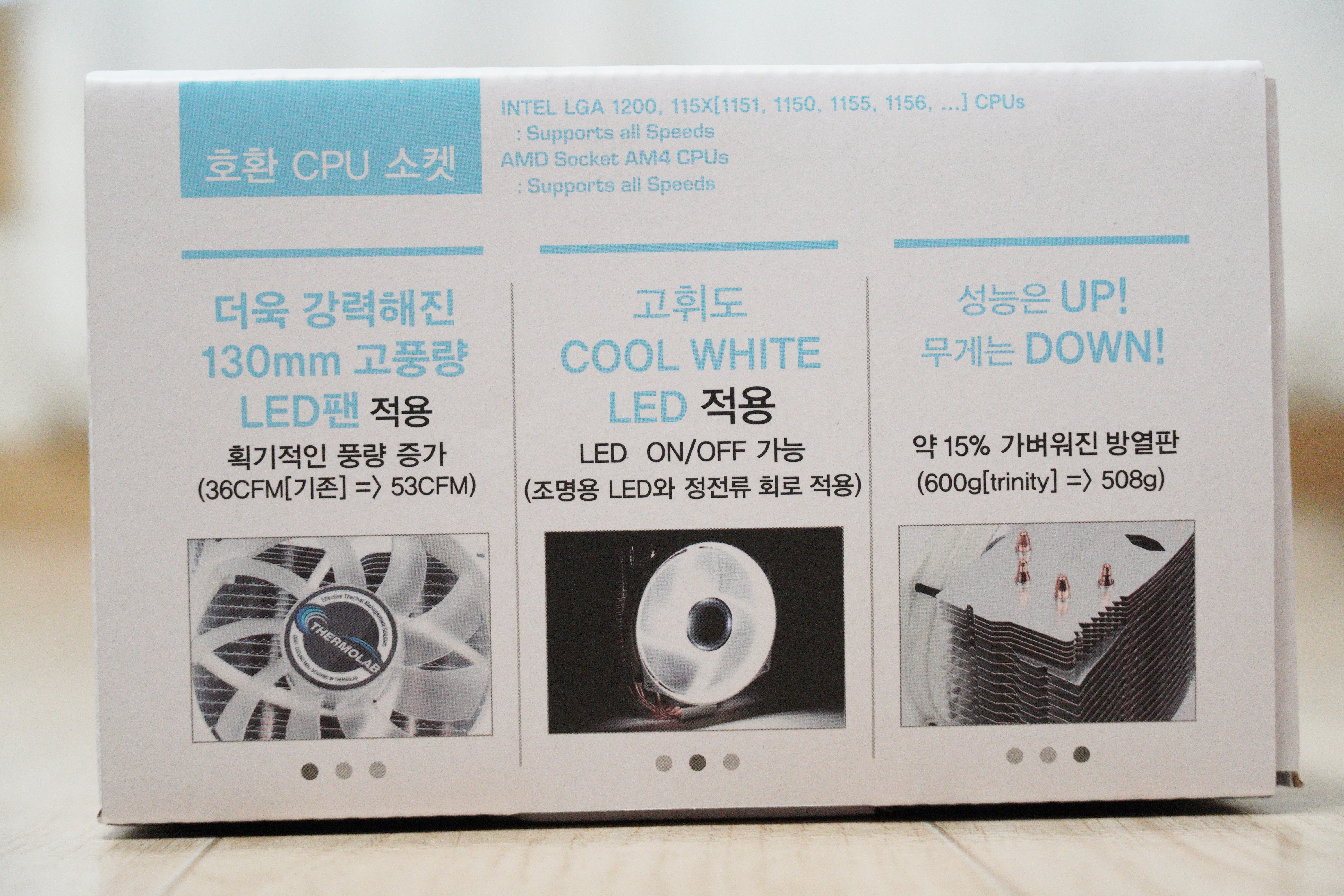 정겨운 디자인이네요. 전면에는 제품 렌더링과 써모랩 트리니티 화이트 6.0 로고가 박혀있습니다. 트리니티 시리즈는 저소음 고풍량으로 가격대비 성능도 착하고 정숙하죠.