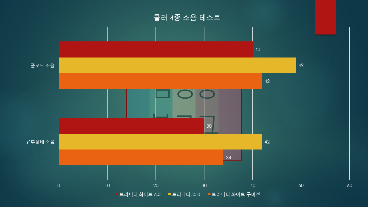 하지만 풀로드 온도의 경우, 이번에 나온 화이트 6.0이 제일 낮았습니다. 원인을 추정해보자면 제가 가진 쿨러들이 구형(업그레이드가 안된 버전)이라 그럴 수 있다고 봅니다.