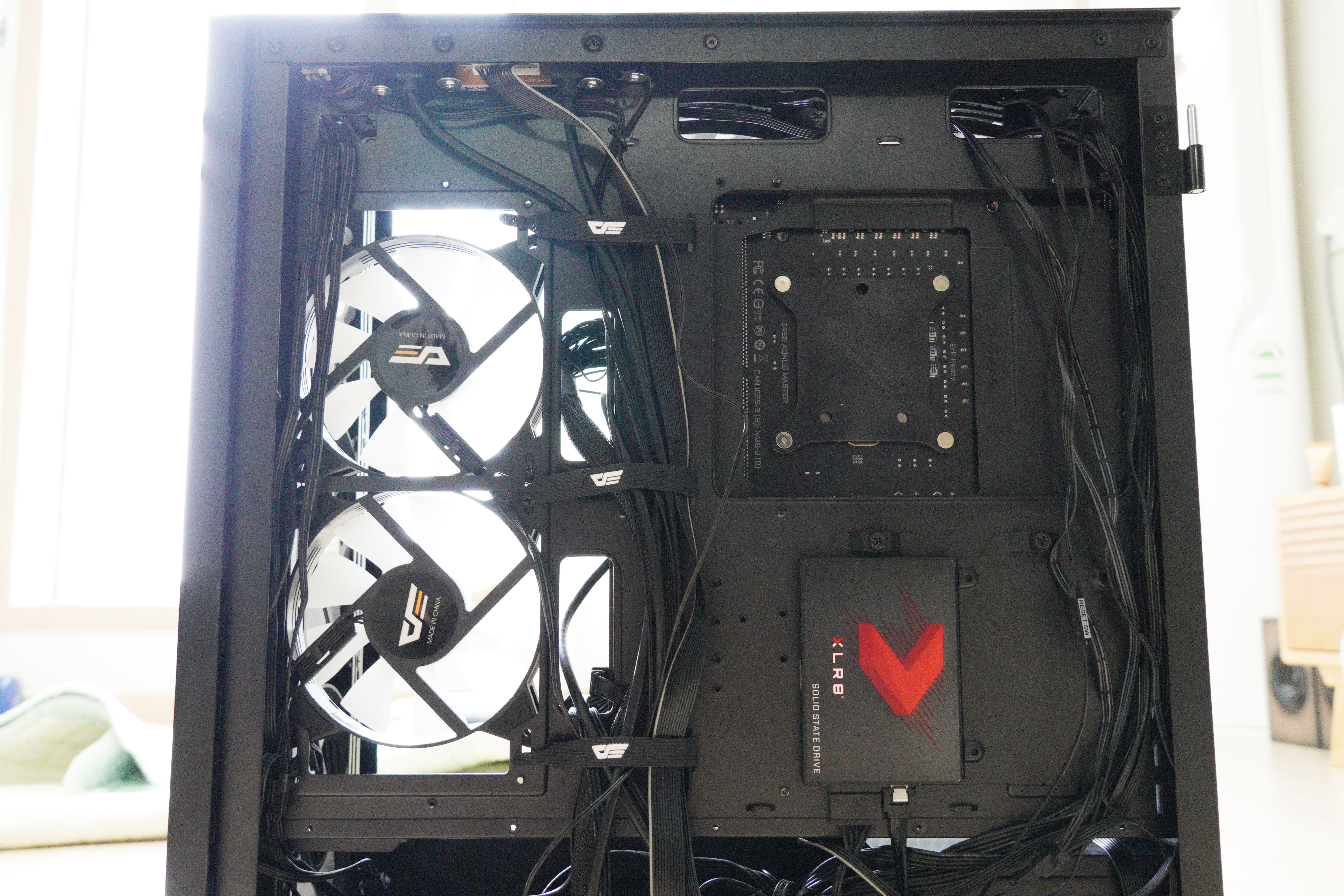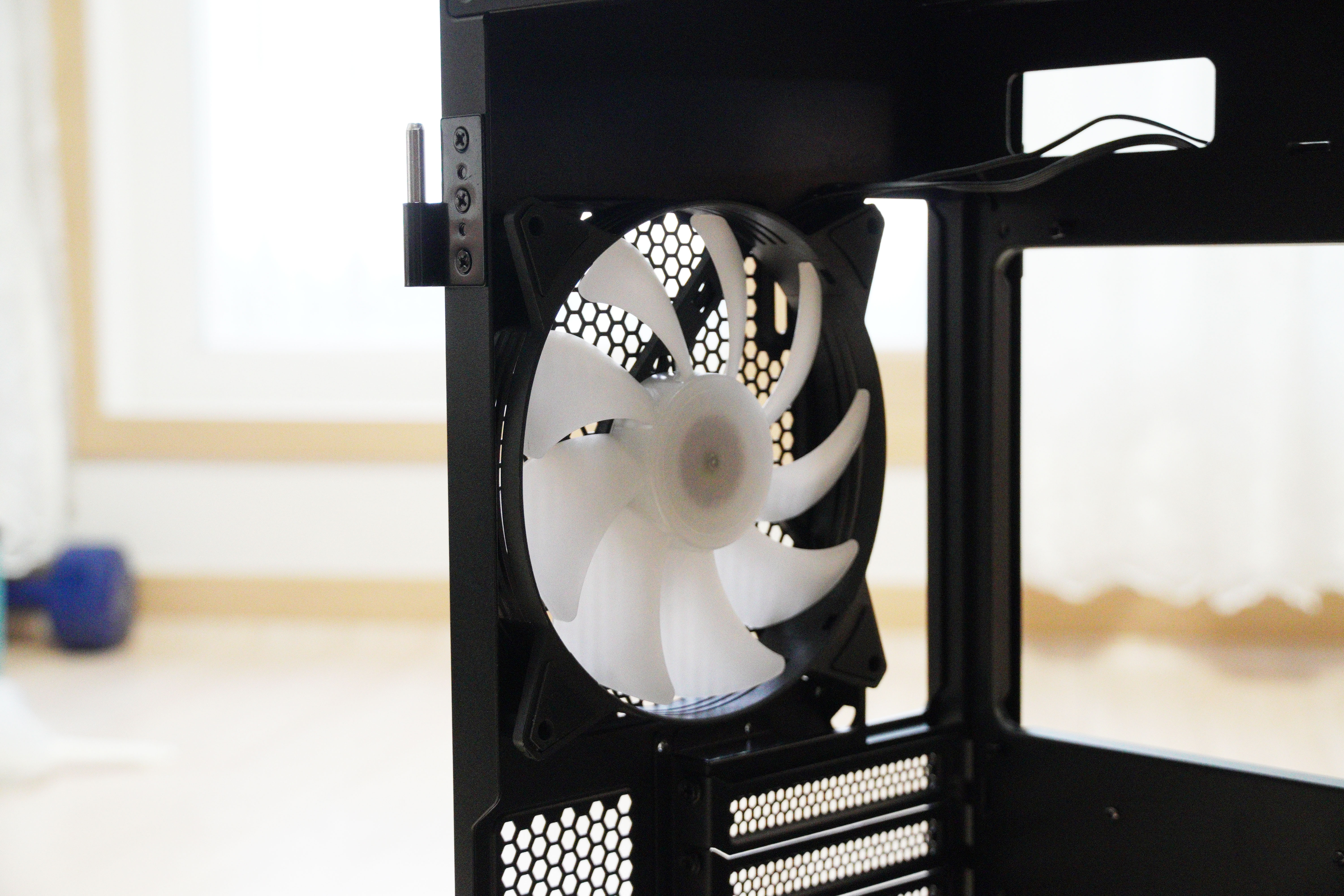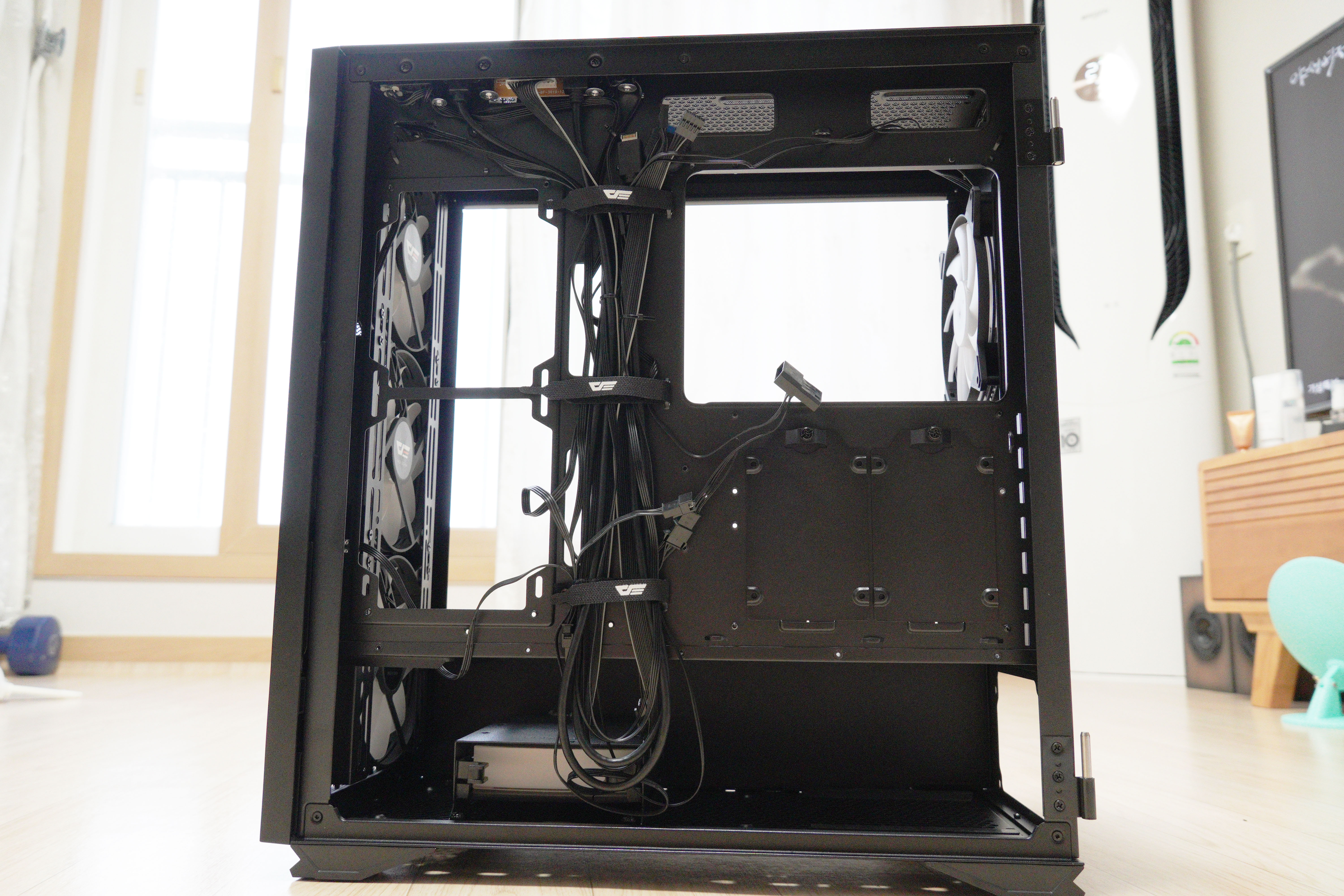 후면의 경우 넓은 공간과 벨크로로 편하게 선정리를 할 수 있습니다. 기본 구성 팬의 경우 풍량과 LED 역시 만족스러운 수준이였습니다.