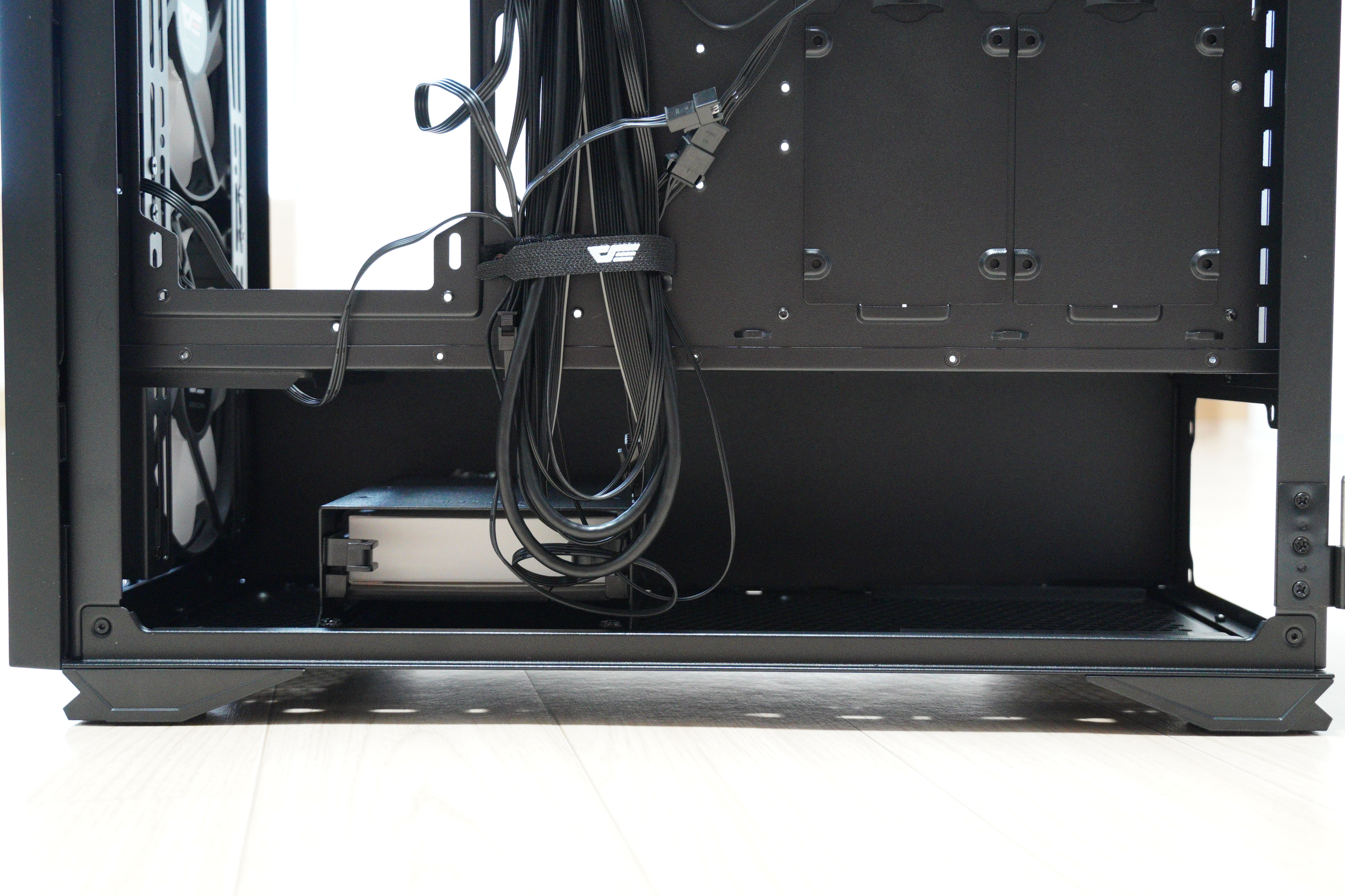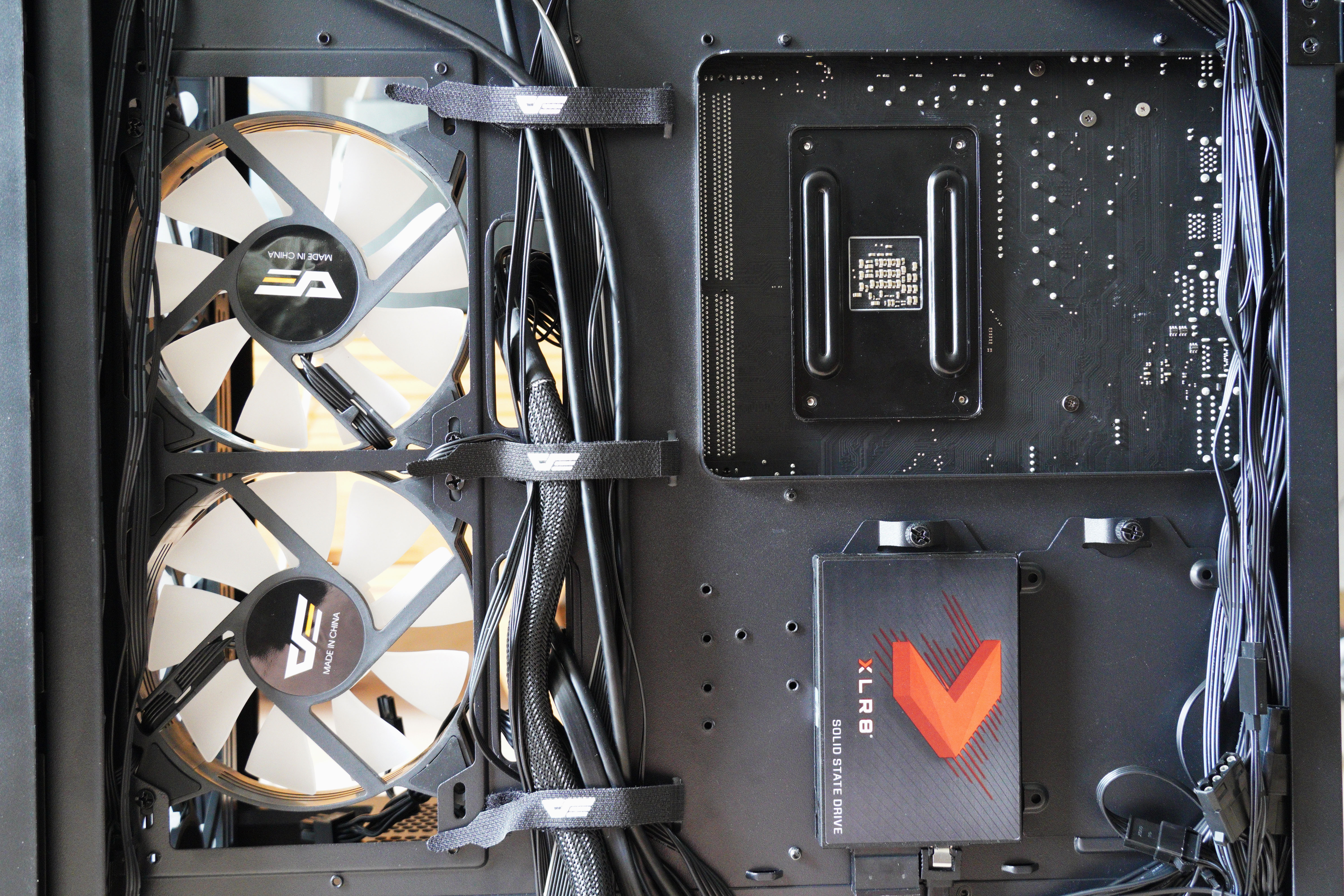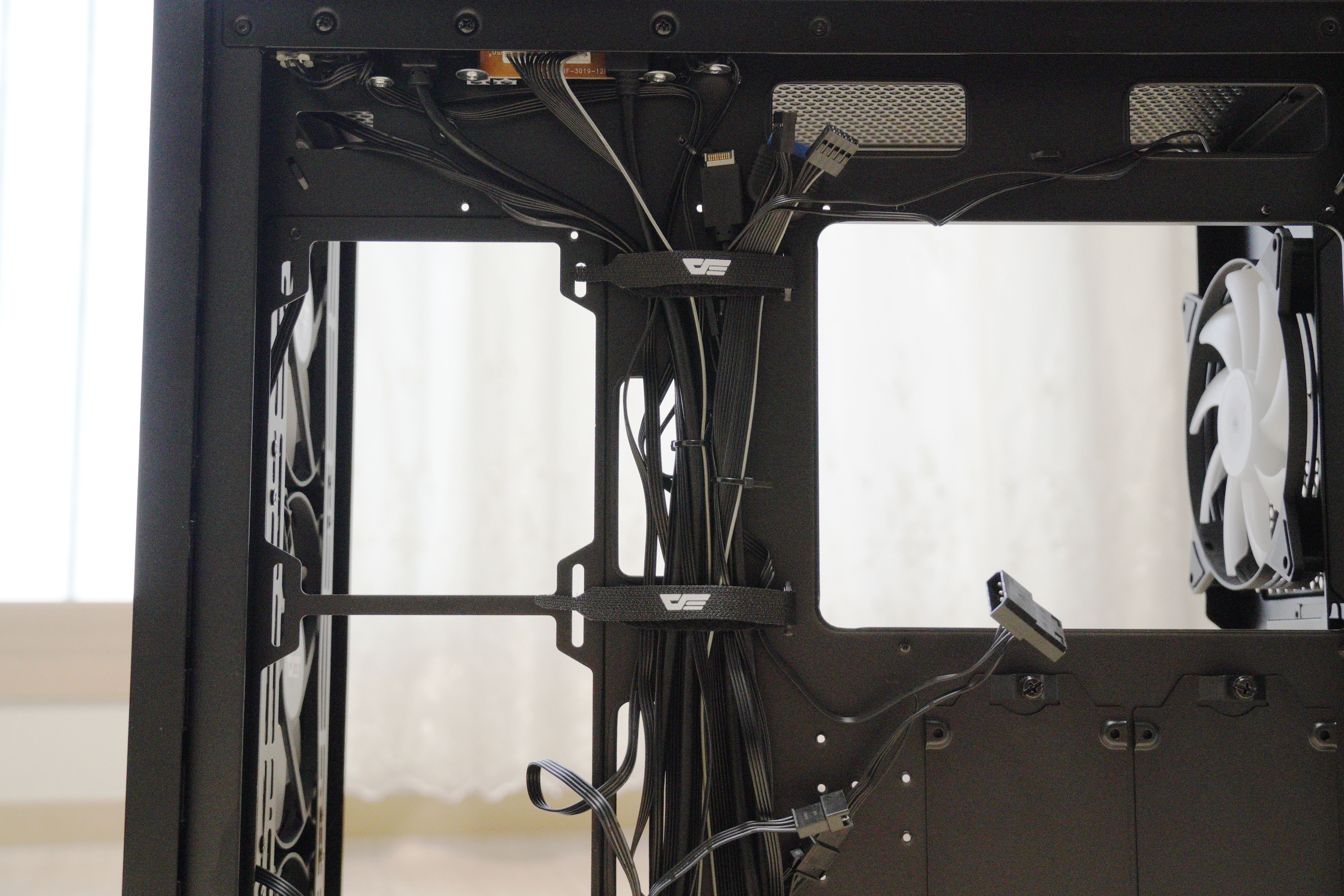 후면의 경우 넓은 공간과 벨크로로 편하게 선정리를 할 수 있습니다. 기본 구성 팬의 경우 풍량과 LED 역시 만족스러운 수준이였습니다.