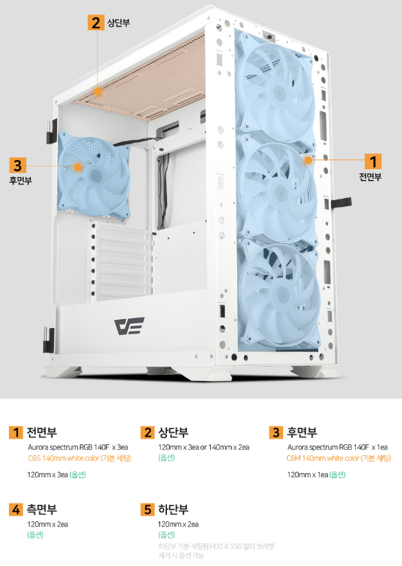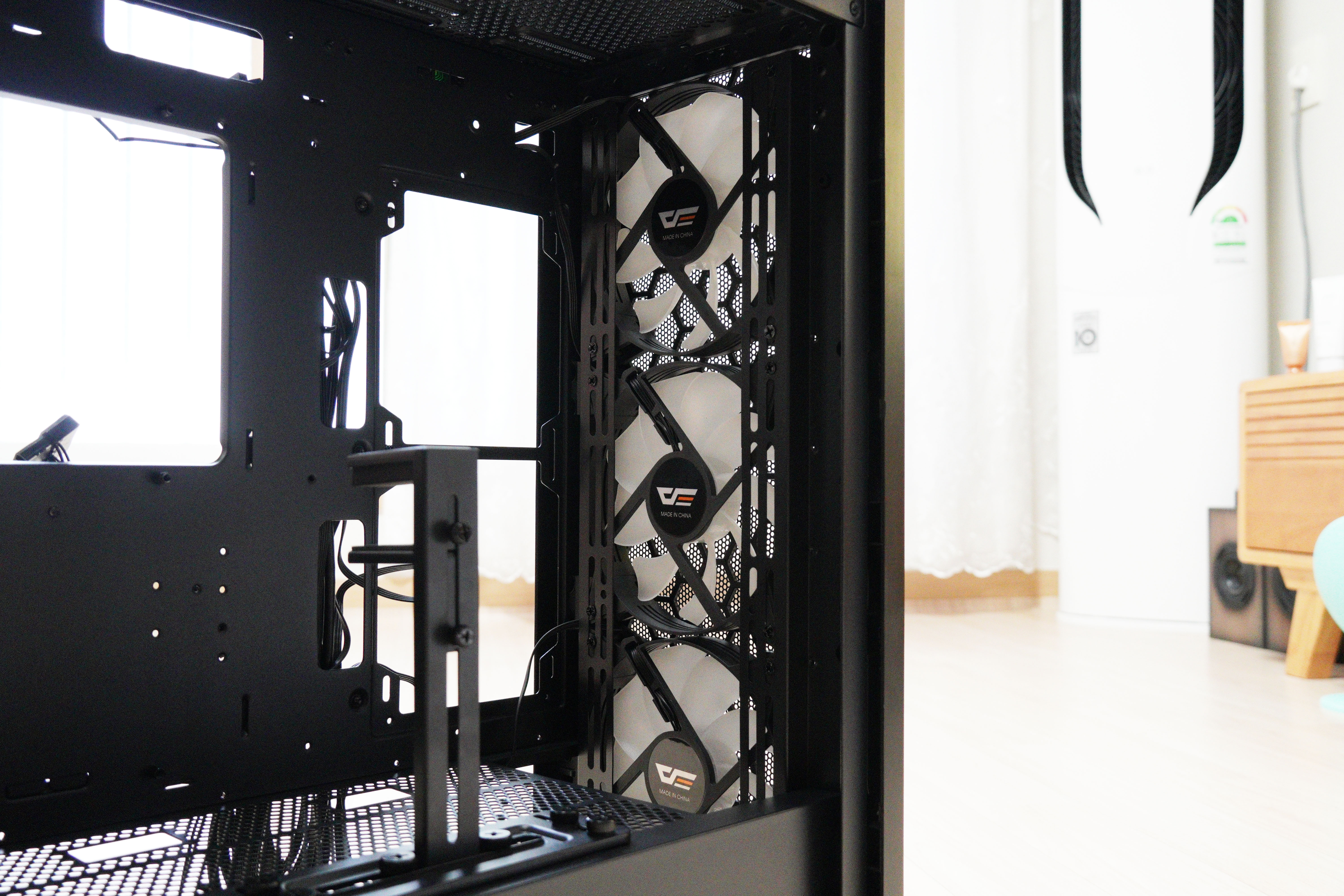 후면에 장착된 팬의 경우, Master Fan으로 LED 색상을 바꾸는 메인 팬입니다. 저 팬에서 나온 LED 선을 통해 호환되는 darkFlash사의 팬(darkFlash 오로라 스팩트럼 RGB 팬(C6S RGB 팬))과 연결하여 추가적으로 LED를 구성할 수 있습니다.