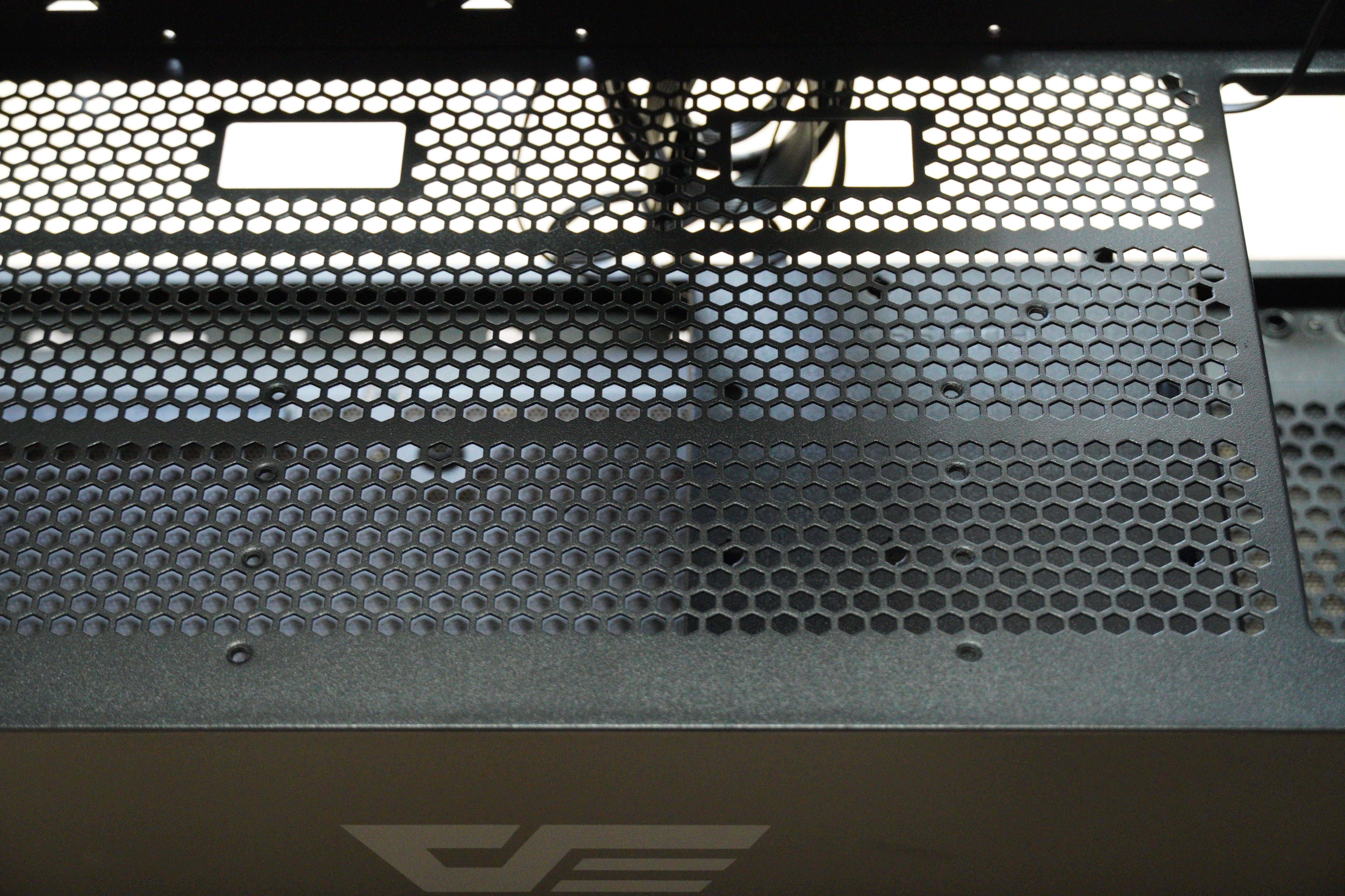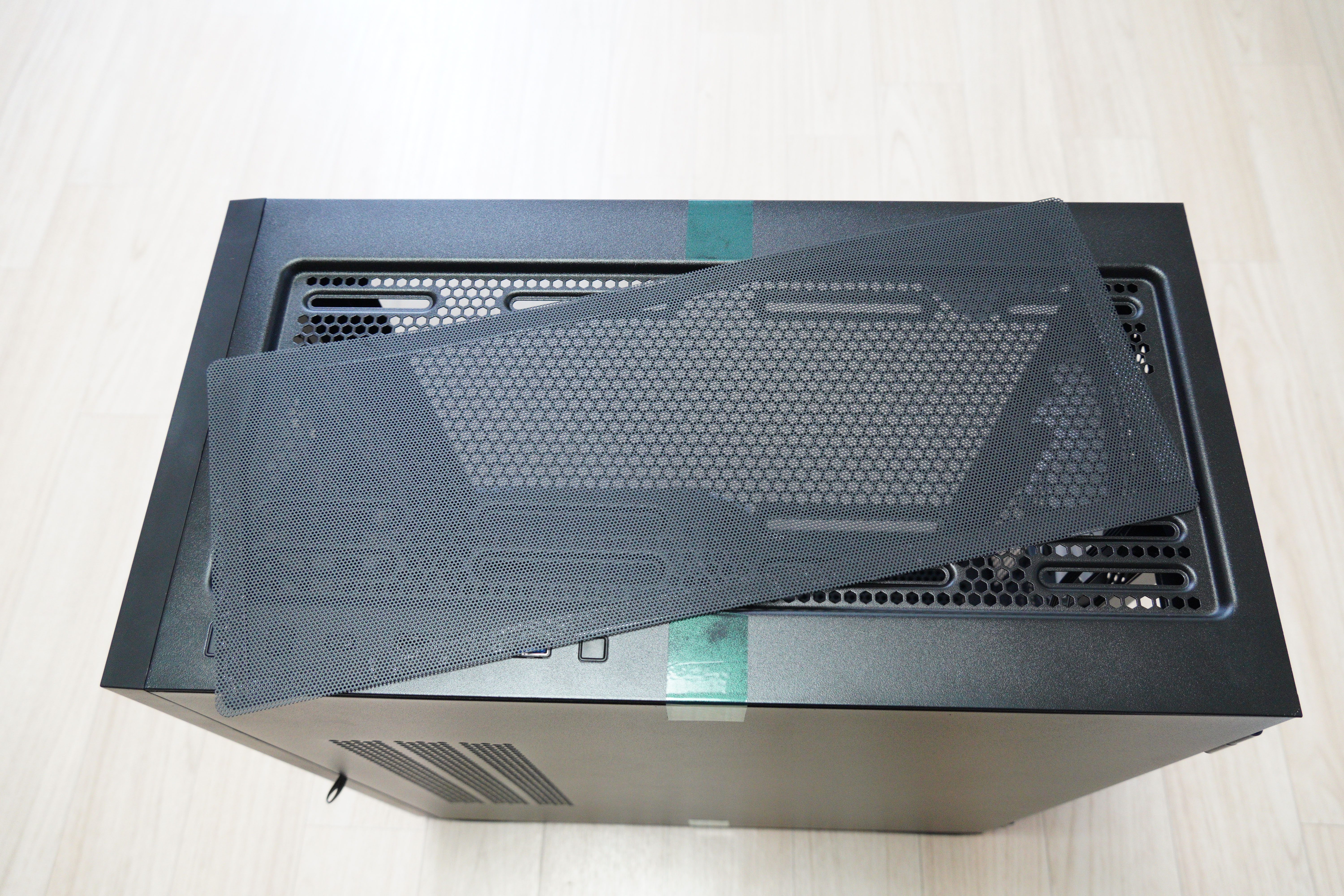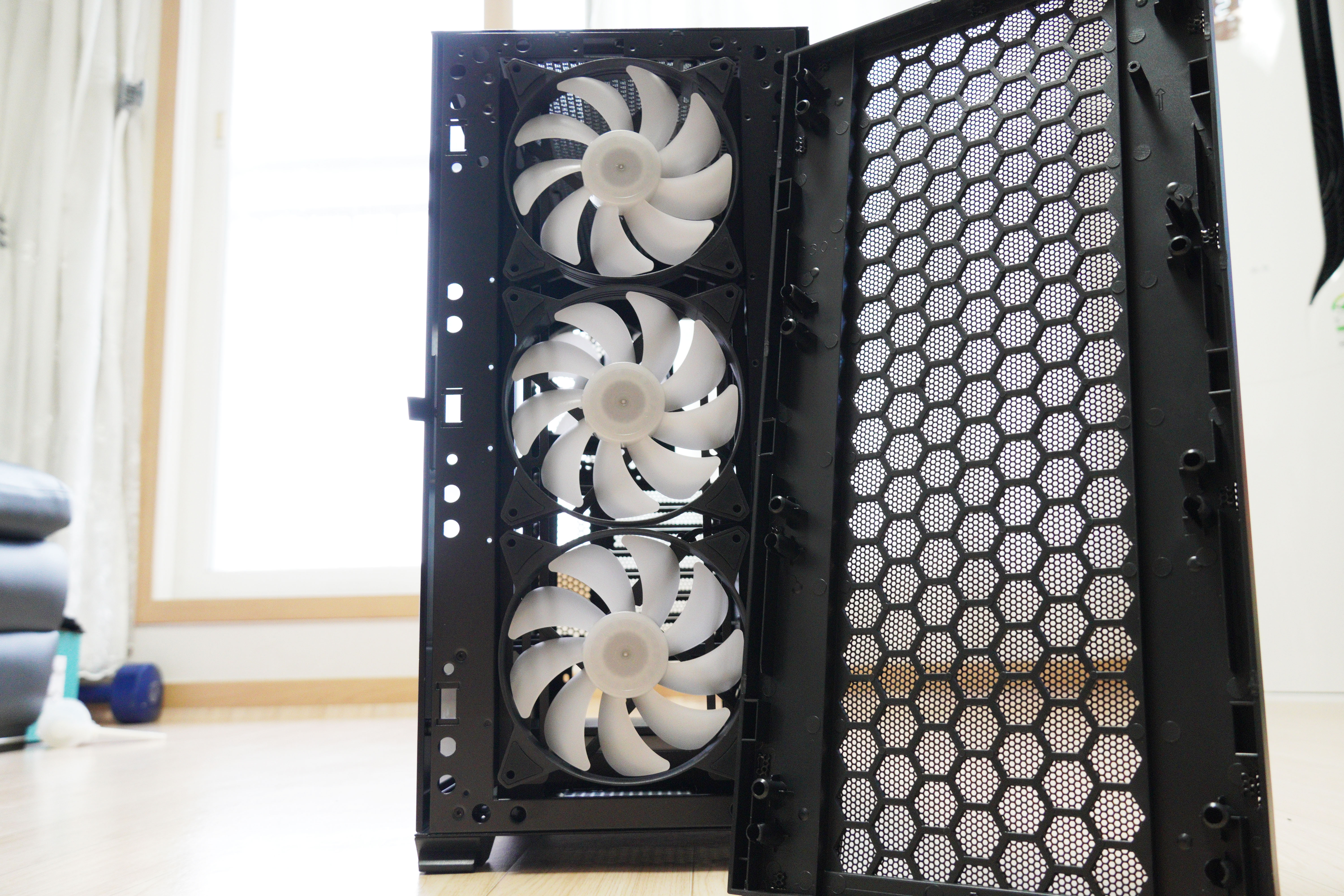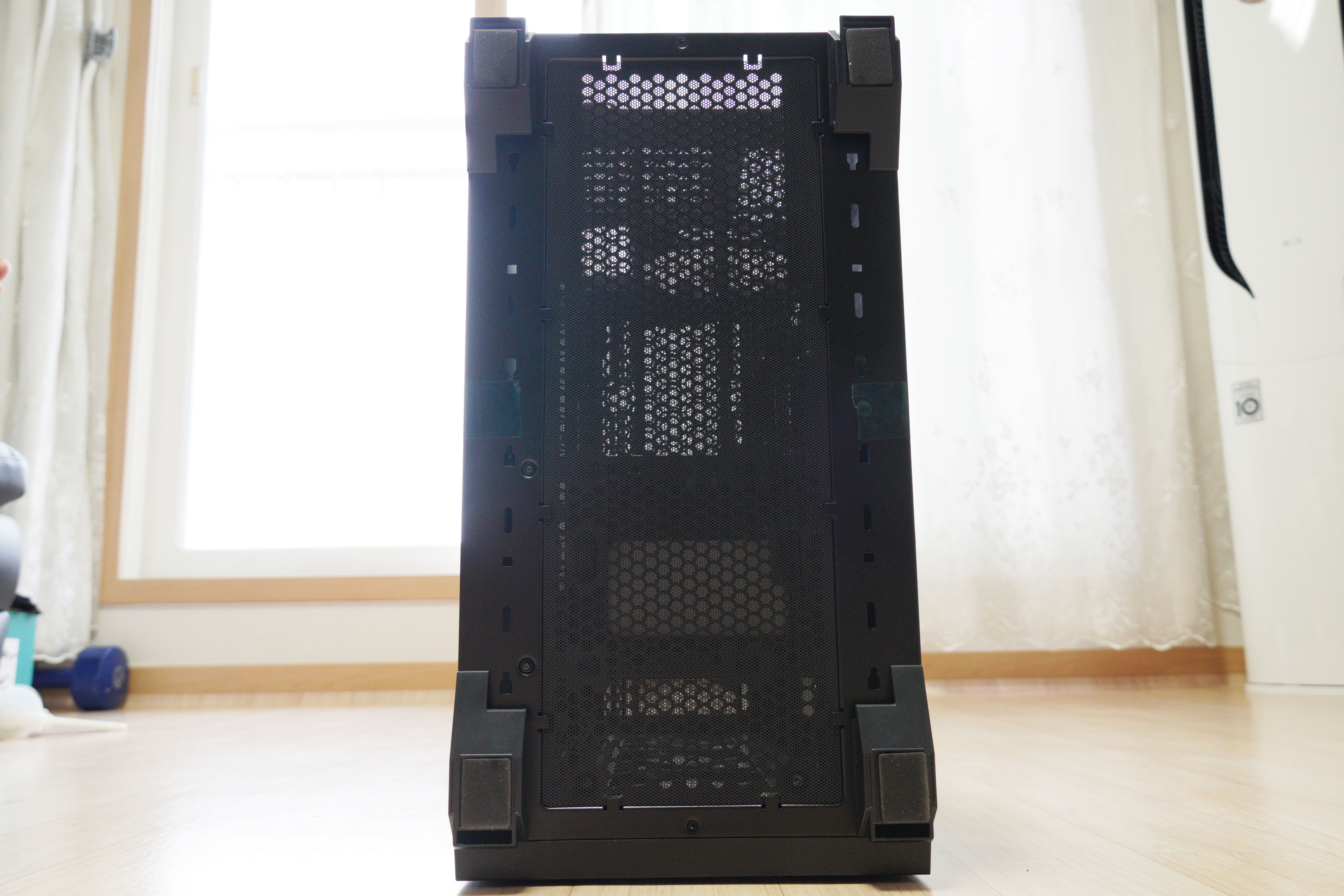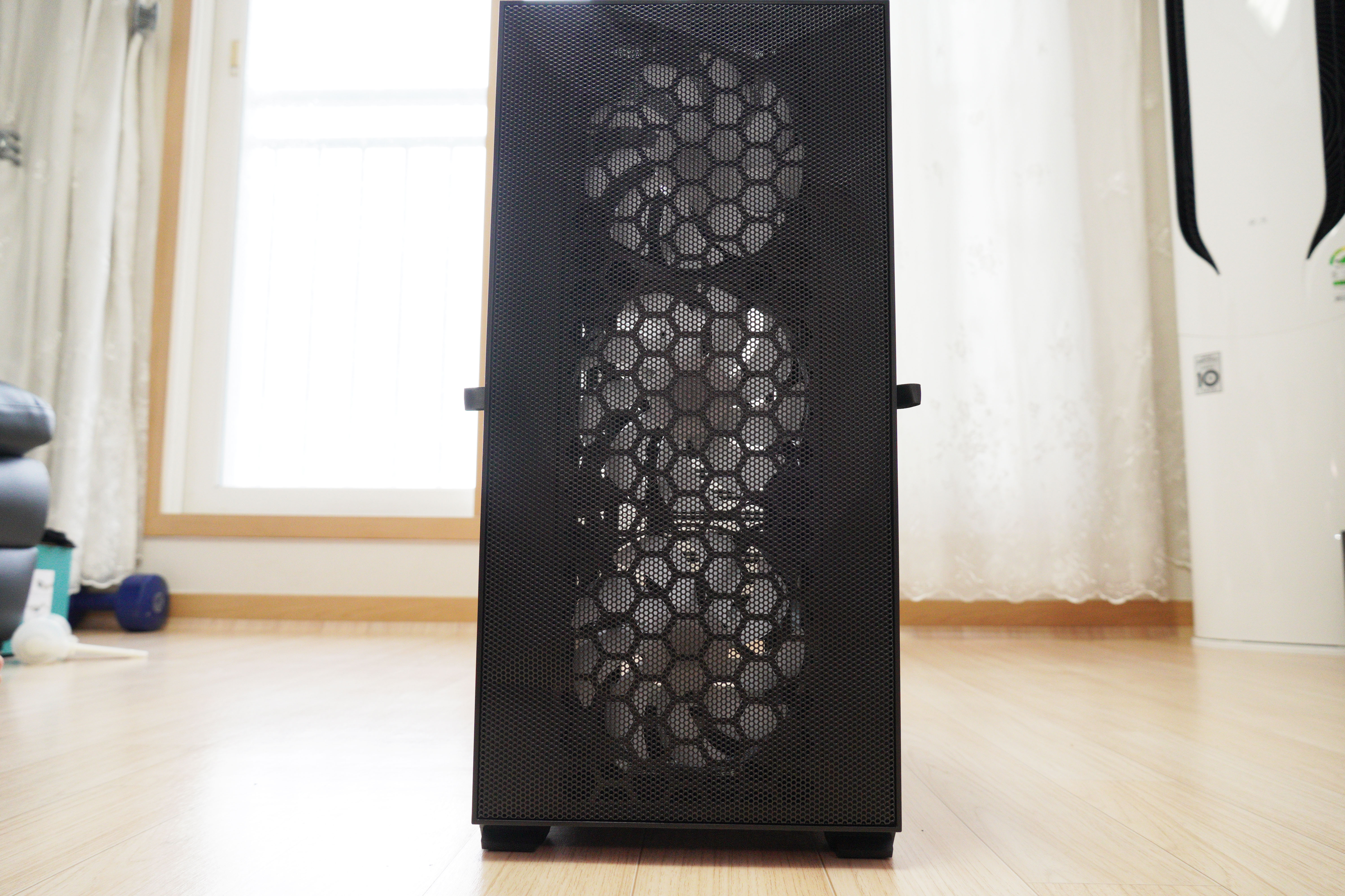 케이스 외관을 먼저 보자면, 전면은 140mm 3팬이 기본적으로 탑재되어있으며, Mesh버전이라 구멍이 뚫려있습니다.