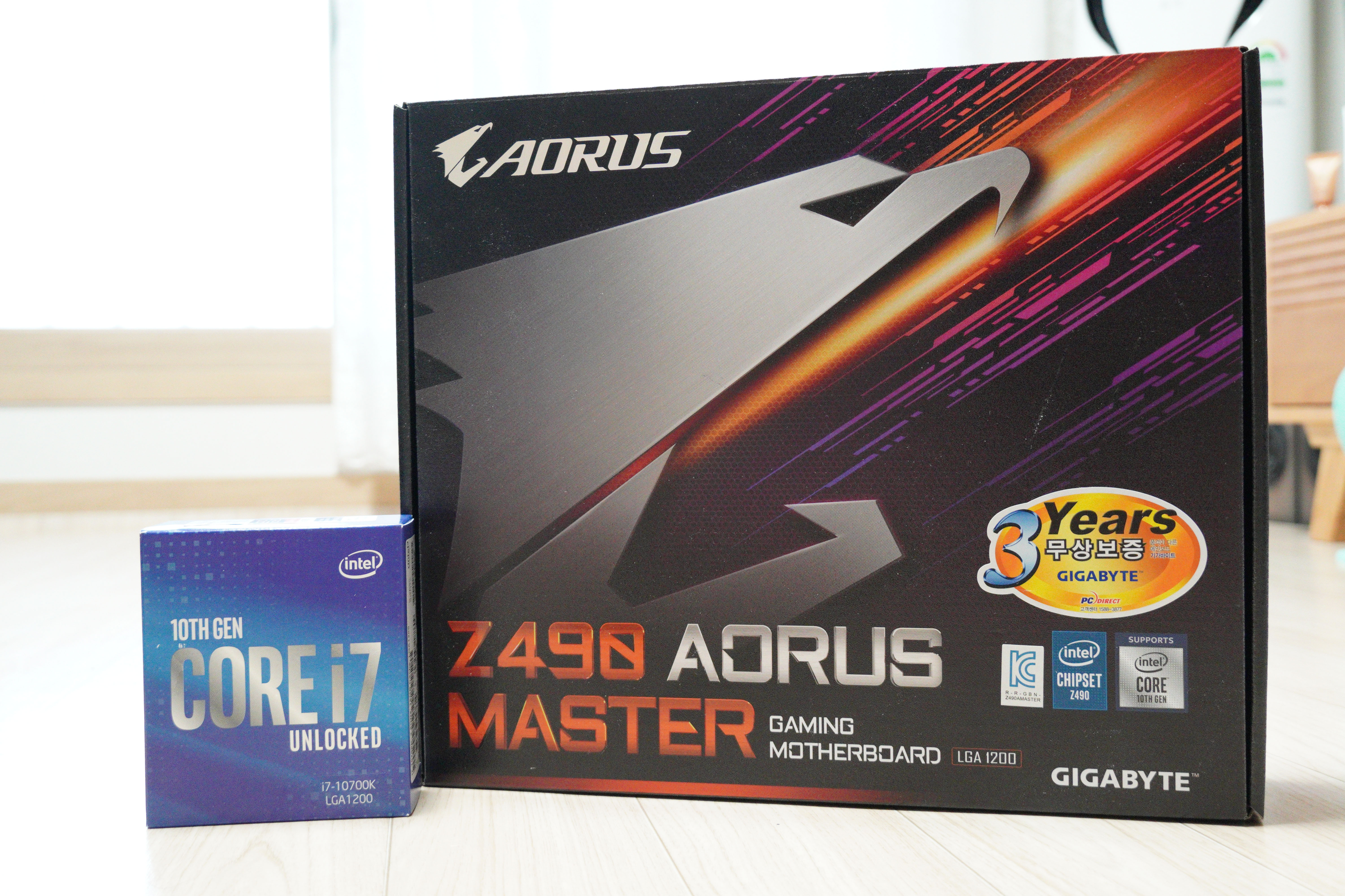 사용한 부품은 인텔 i7-10700k와 기가바이트 Z490 AORUS MASTER 메인보드와