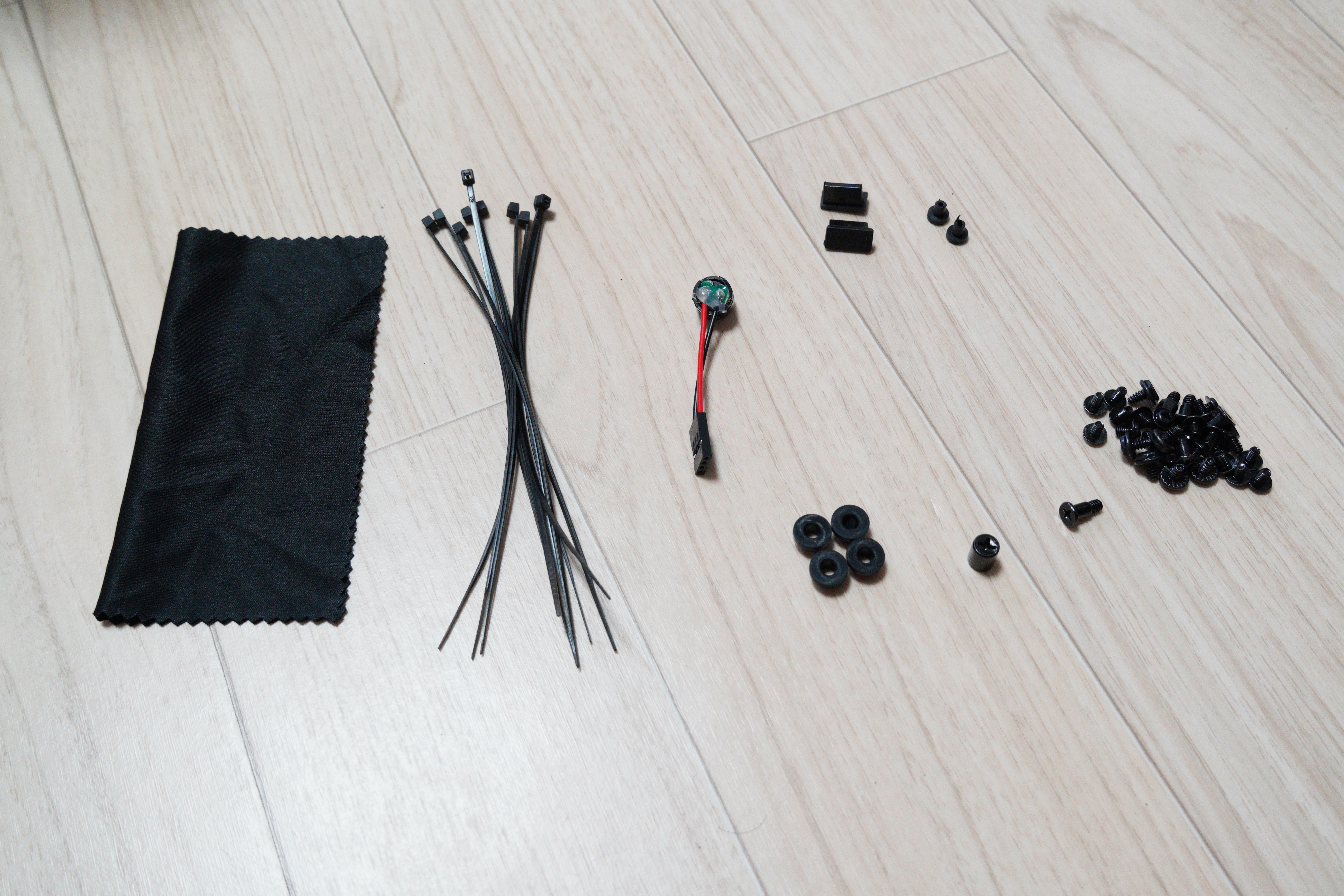 구성품의 경우, 강화유리를 청소하기 위한 천, 케이블타이, 스피커, USB / Audio 먼지방지마개, 각종 나사들입니다.