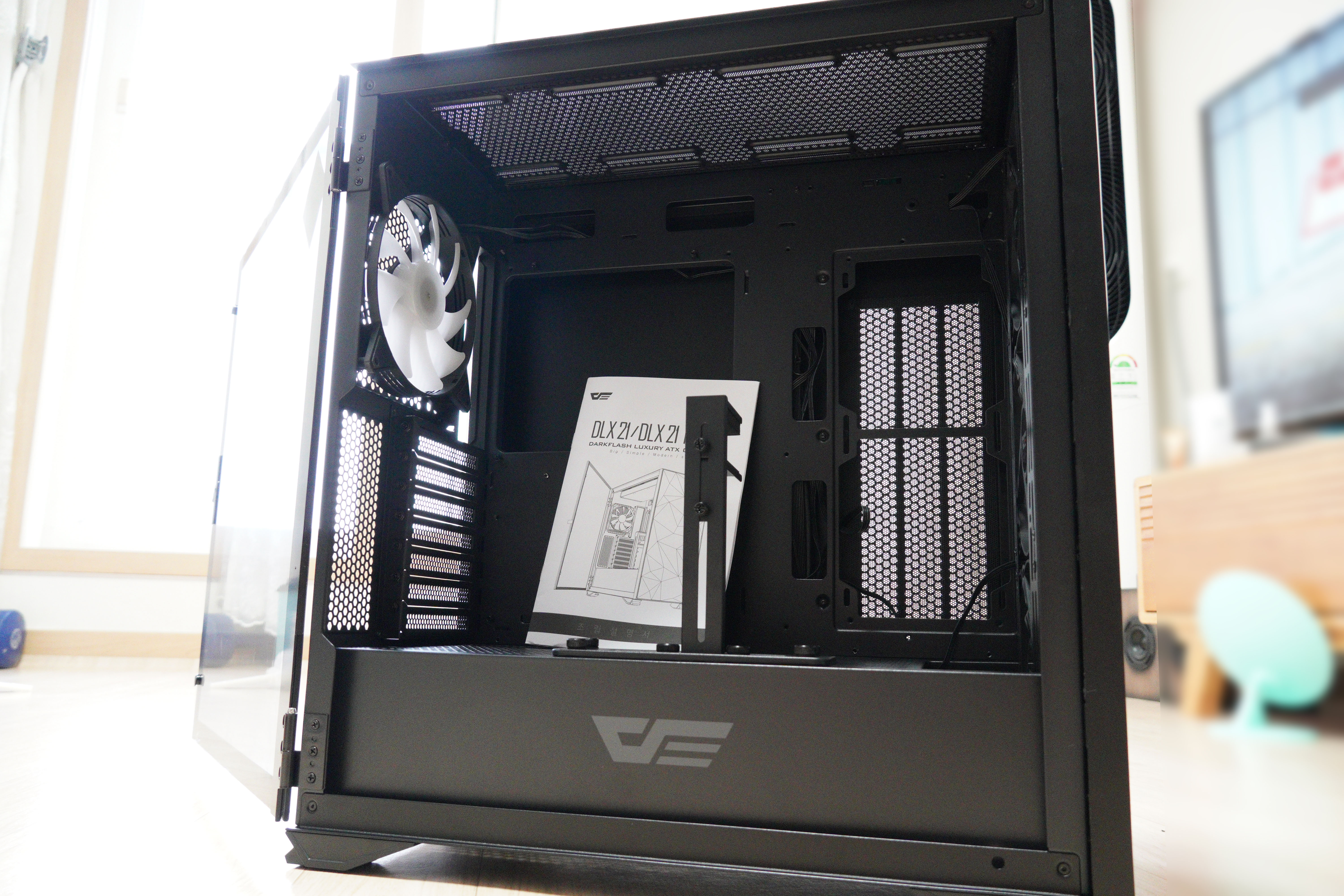 내부에는 설명서와 그래픽카드 지지대가 눈에 띕니다. 보통 그래픽카드 지지대는 고급 그래픽카드의 구성품으로 들어있거나 별도구매를 하는데, 다크플래쉬 DLX21에는 기본으로 탑재가 되어있습니다.