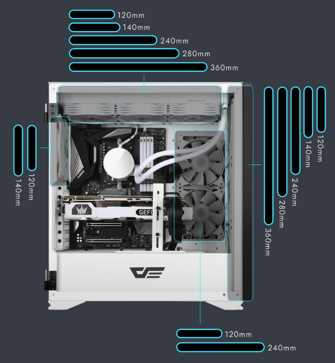 팬구성의 경우 다음과 같이 최대 11개까지 장착 가능합니다. 특이한건 측면에도 저렇게 장착이 되요!