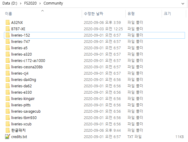 자기의 스팀 라이브러리 폴더의 FS2020폴더에 있는 Community 폴더 혹은 1번 방법과 동일