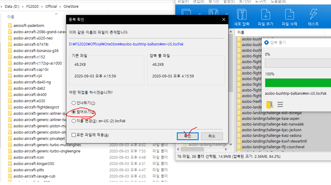 경고 뜨면 덮어쓰기 해주시고요. 각 폴더에 원본 영문 파일이 있기 때문에 문제가 발생하면 원본으로 돌리시면 됩니다.