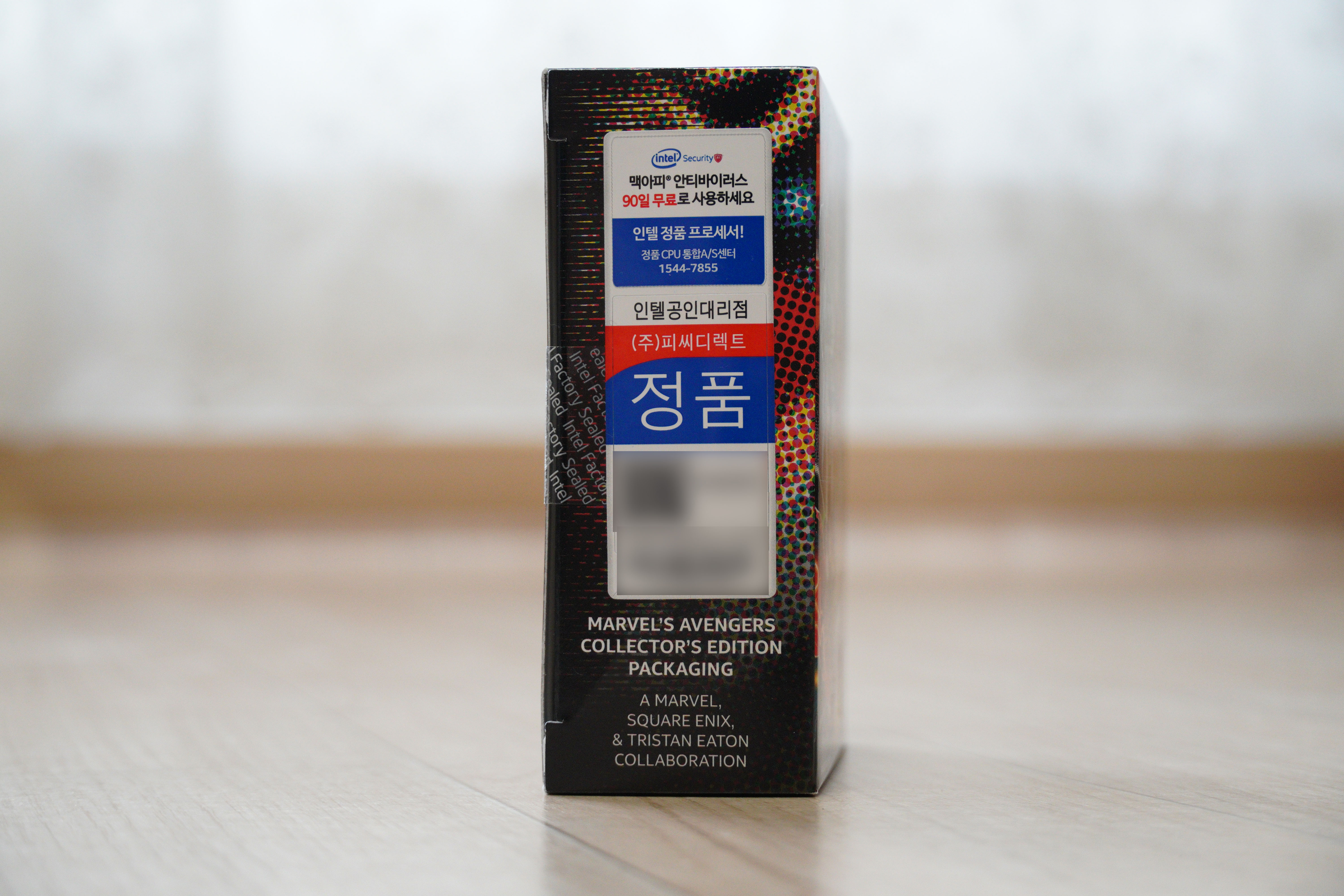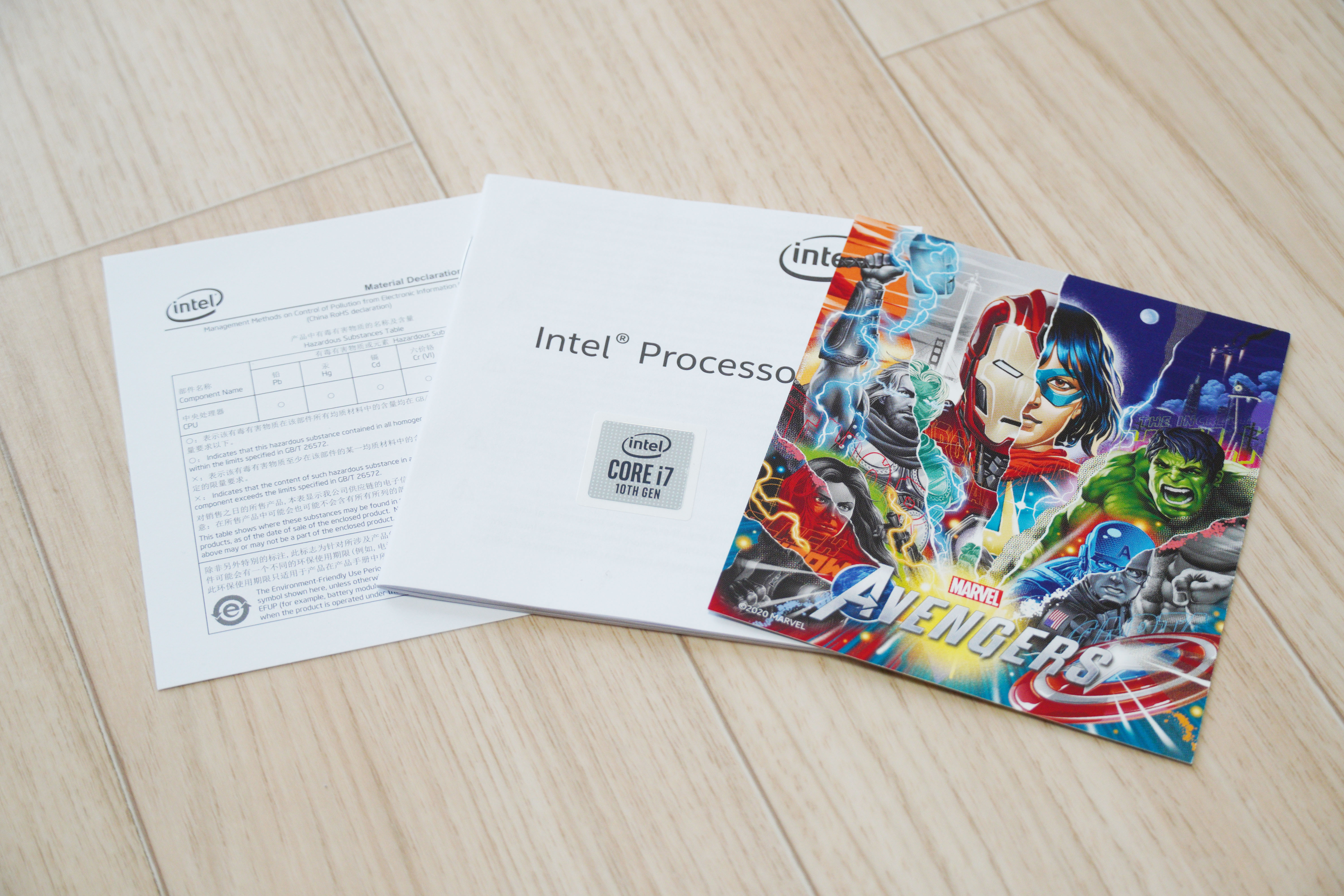 내부에는 다른 인텔 프로세서처럼 스티커가 붙은 설명서와 보증서가 있으며, 어벤져스 에디션에는 저런 스티커가 있습니다.