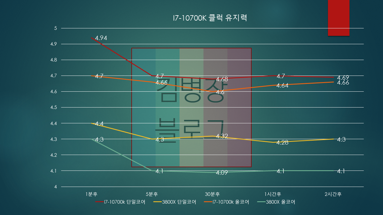 처음에는 피크를 찍다가 4.7~4.6Ghz선을 유지하는걸 볼 수 있습니다.