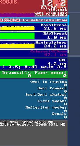 이렇게 Coherent GT Draw에 의해 프레임이 10~12로 고정되고 안올라가는 버그가 있습니다.