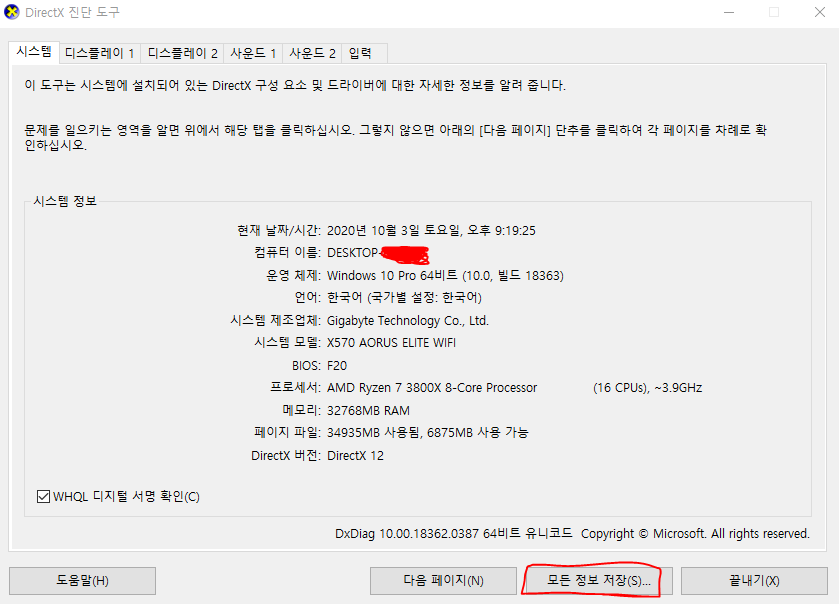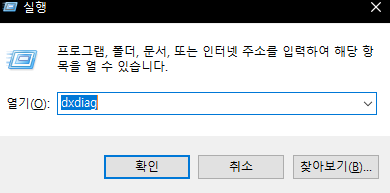 다시 윈도우키 + R을 누른 후 이번에는 dxdiag 타이핑