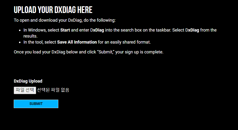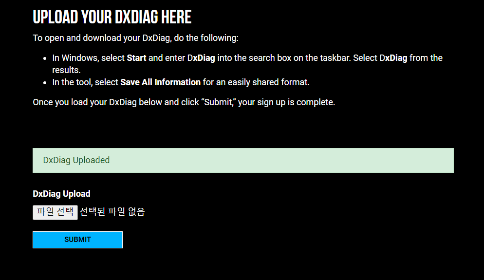 최하단의 DxDiag Upload에서 아까 저장한 DxDiag.xml 파일 업로드