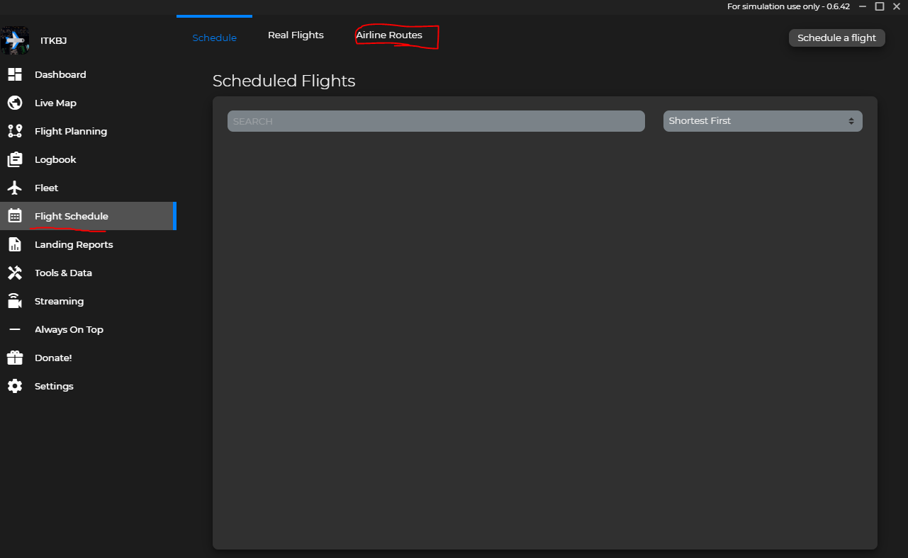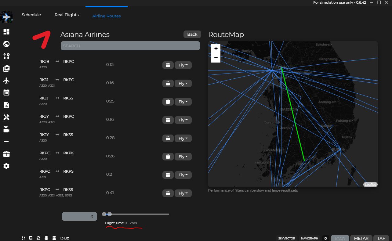 저는 Flight Schedule 기능을 먼저 이용합니다. Airline Routes를 이용하면, 실제로 비행하는 항공사들이 이용하는 루트를 확인할 수 있고, 이를 통해 더 리얼한 비행이 가능합니다.
