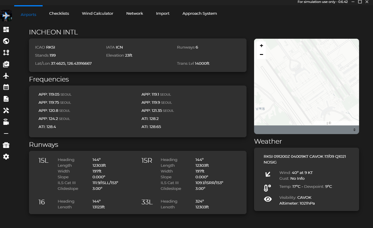 인천공항을 검색해보았는데, 보시면 공항의 위치, 활주로 정보, 주파수 정보 및 METAR 정보와 그에 대한 해석 정보까지 모두 들어있습니다. APPR 할때 보면 도움되는 정보들입니다.