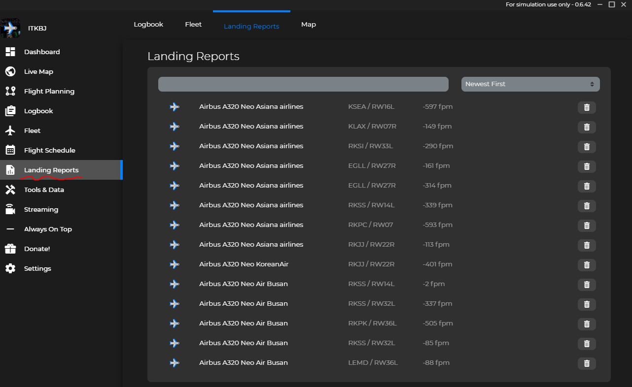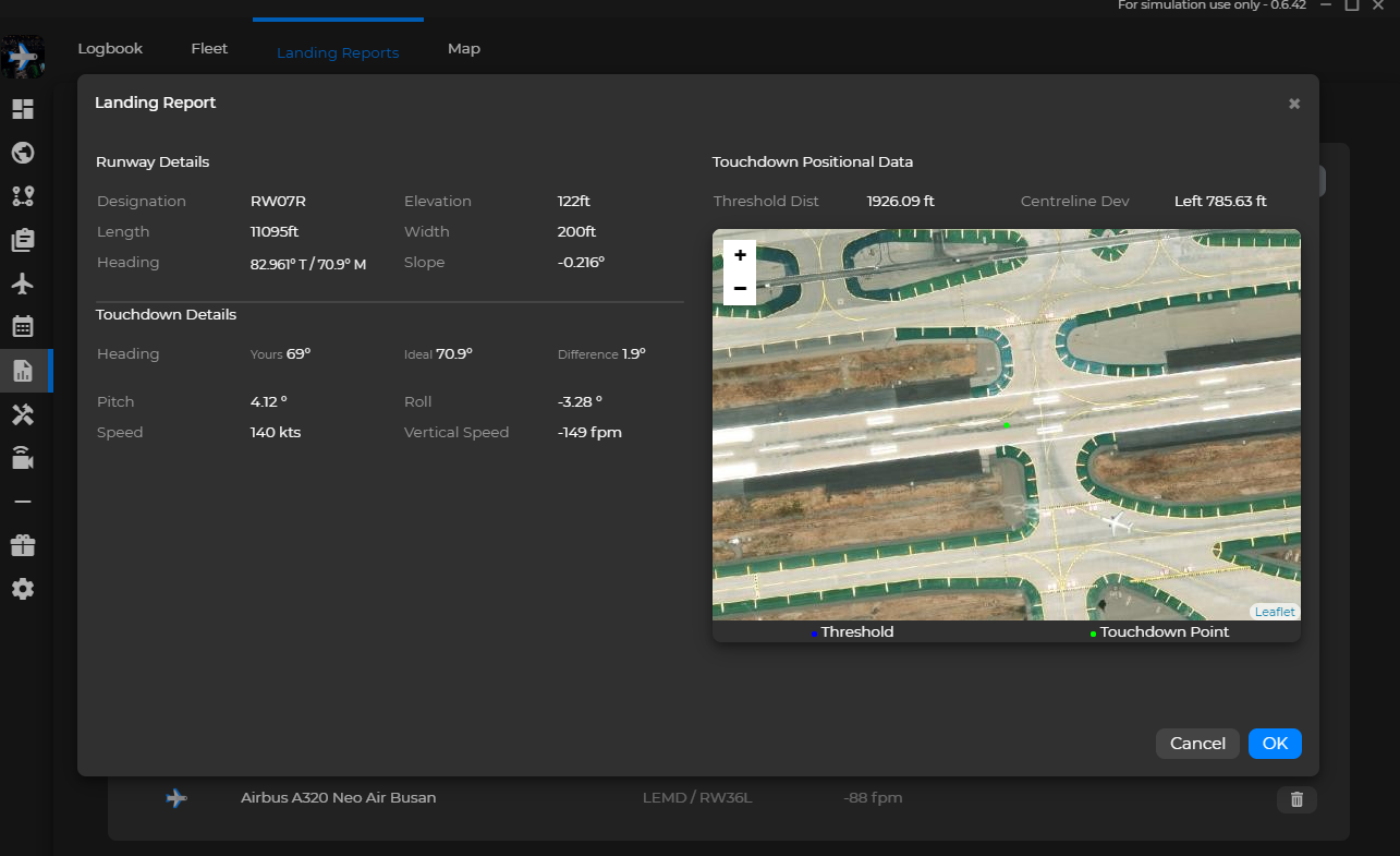 다음은 Landing Report입니다. 플라이트시뮬레이터를 실행하시고, Simtoolkit 프로그램을 실행, 연결해놓으면 자동으로 수집합니다.