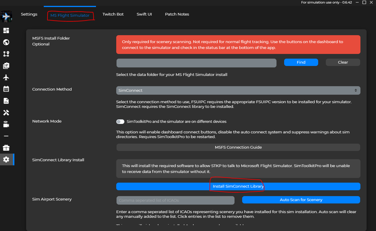 플라이트 시뮬레이터에서 이 툴을 제대로 사용하기 위해서는 먼저 Simconnect Library가 설치되어있는지 확인해야합니다.