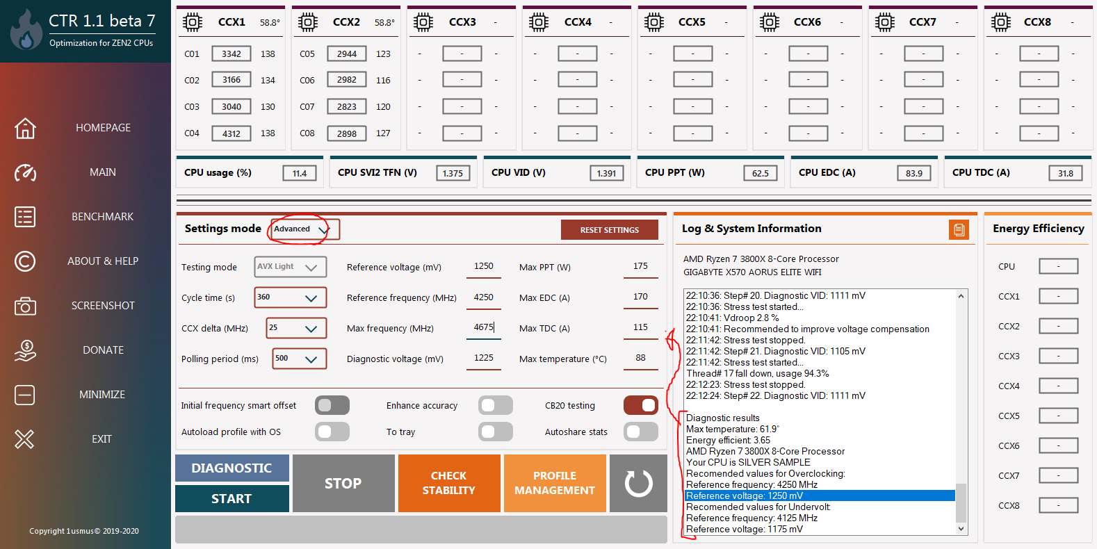 왼쪽의 MAIN 탭에 가면, CPU의 상태를 볼 수 있습니다. 먼저 하단의 DIAGNOSTIC 버튼을 눌러 CPU의 수율을 테스트합니다.