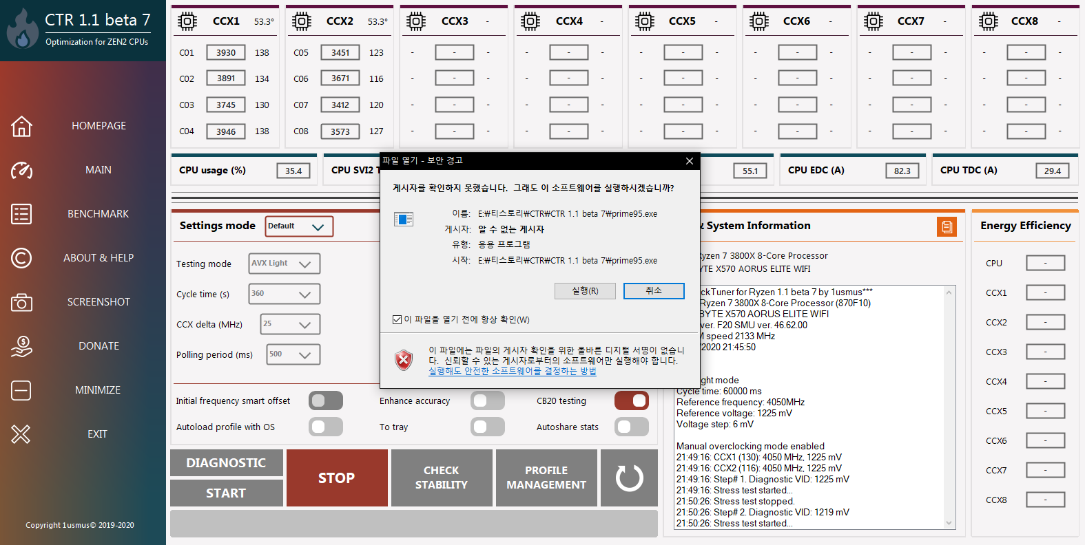 이제 START 버튼을 눌러 안정화에 들어갑니다. 시네벤치 R20을 통해 테스트를 보고 목표 클럭까지 올려줍니다. 이제 쭉 기다리면.... 끝입니다.