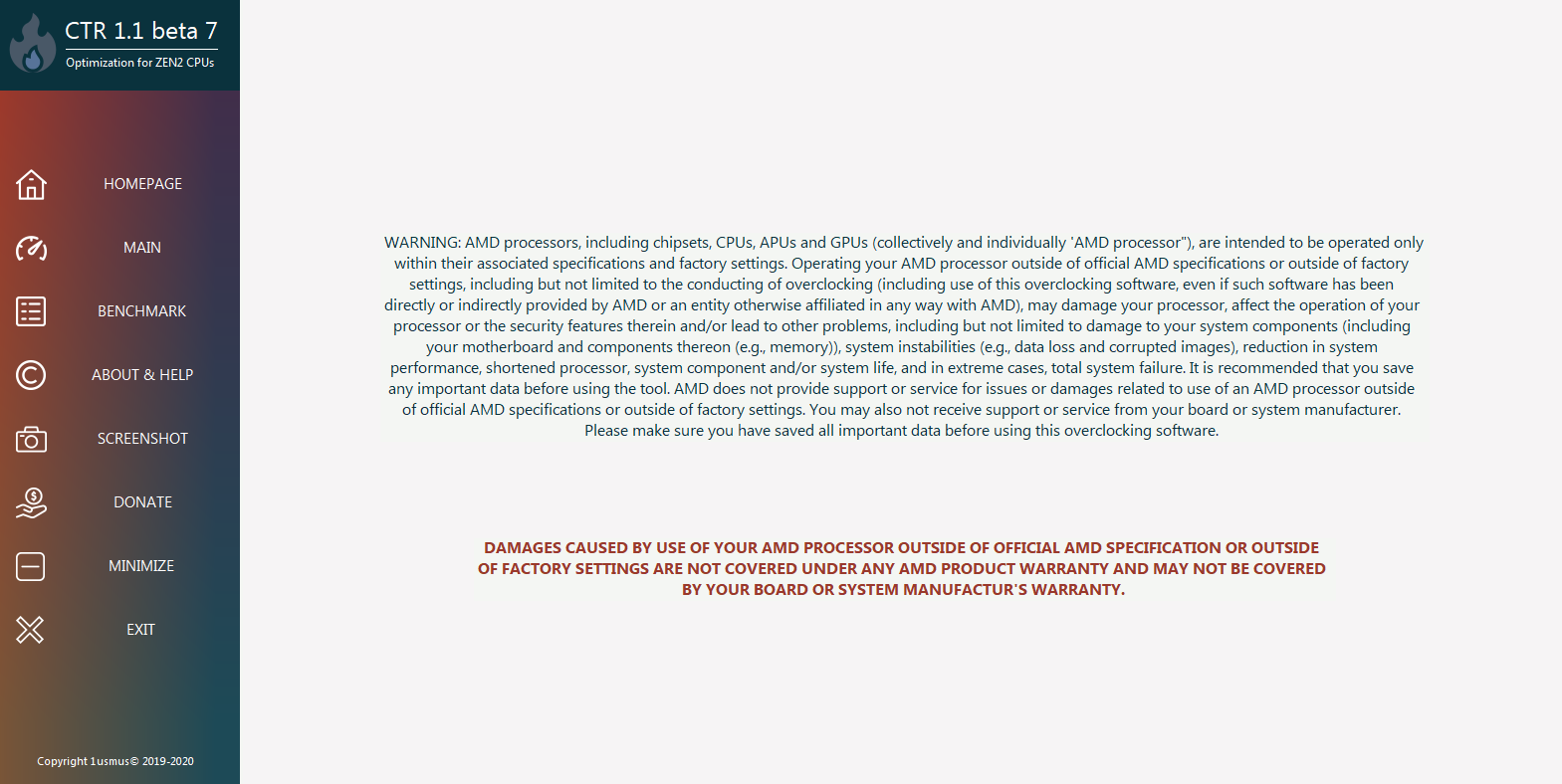 맨 처음 경고는 RyzenMaster의 그것과 동일합니다. 오버클럭이기 때문에, 사용자 과실이며, 손상되면 사용자 책임입니다.