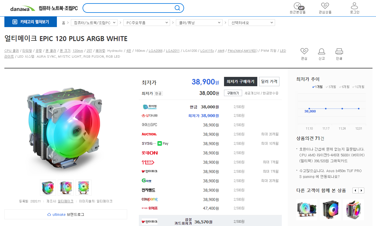 특히 2020년 12월, 다나와 기준 3.9만원이라는 매력적인 가격을 지녔으며, ARGB를 지원하여 메인보드와 연동된 아름다운 LED를 감상할 수 있기 때문에, 디자인과 LED를 고려하는 사용자에게 적합한 제품입니다.