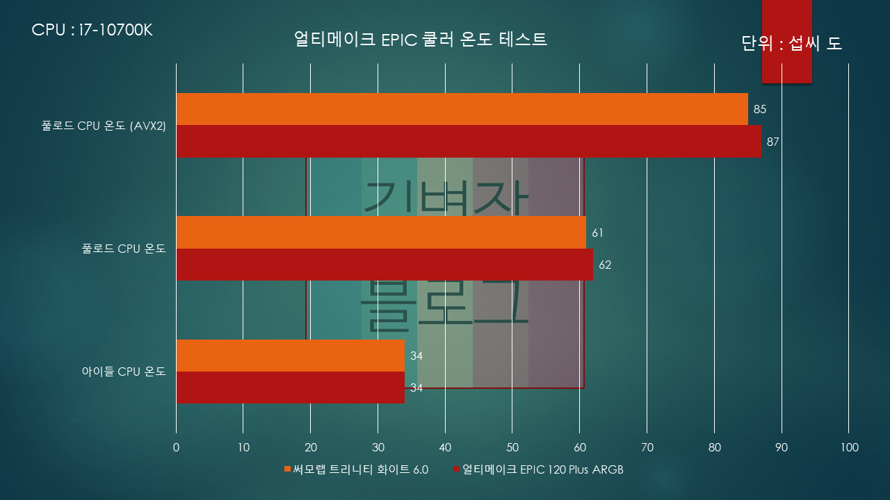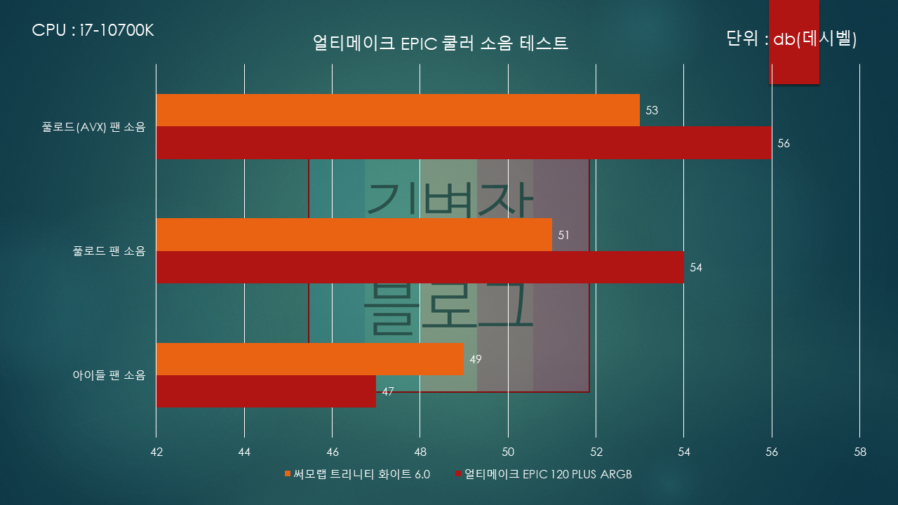 하지만 본체가 열린 상태에서 측정하였기 때문에, 두 쿨러 모두 이어폰을 끼거나 하면 크게 들리지 않을정도로 정숙합니다.