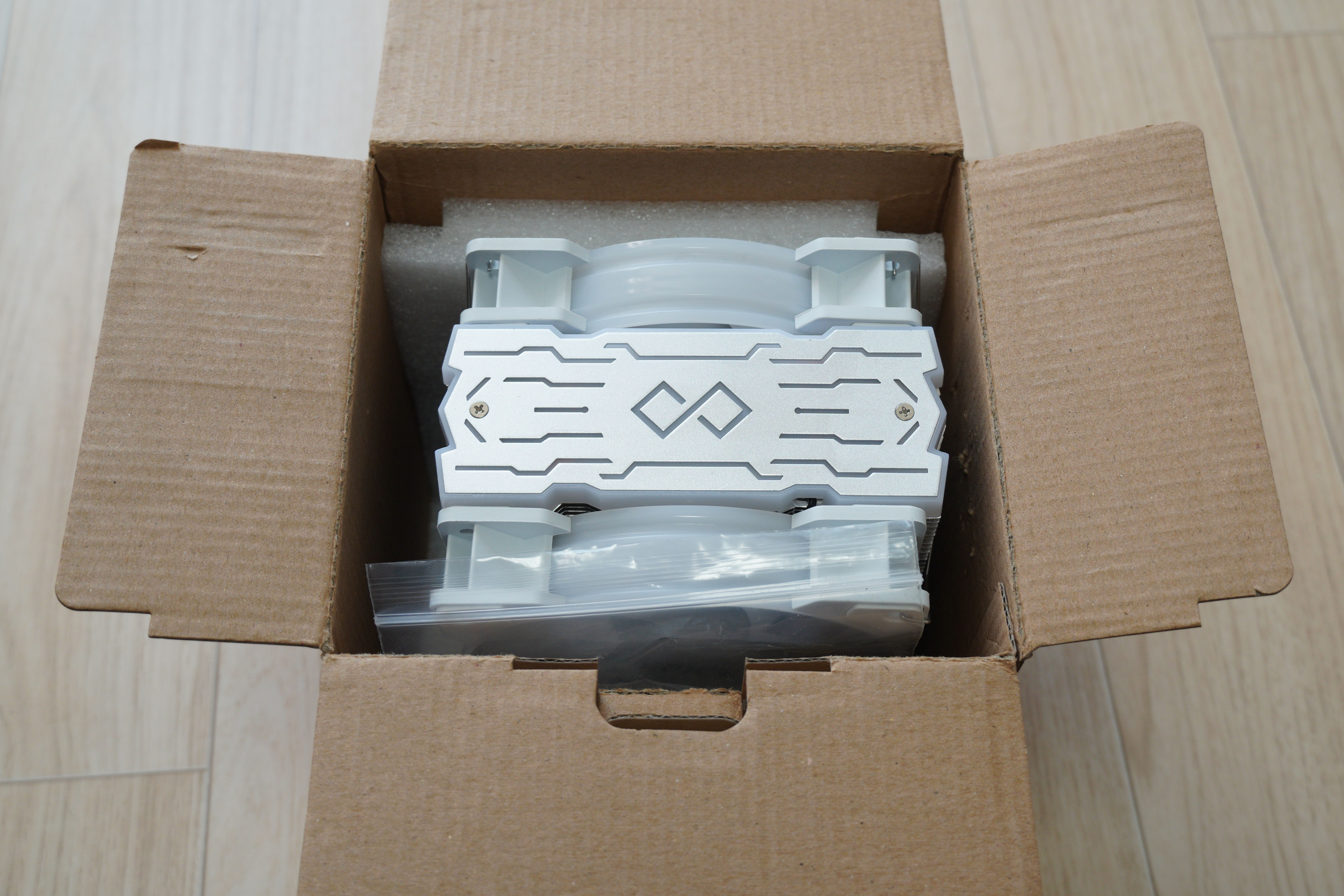 상자를 열어보면, 쿨러가 보입니다. 완충재가 잘 들어있어 안전하게 제품을 받을 수 있습니다.