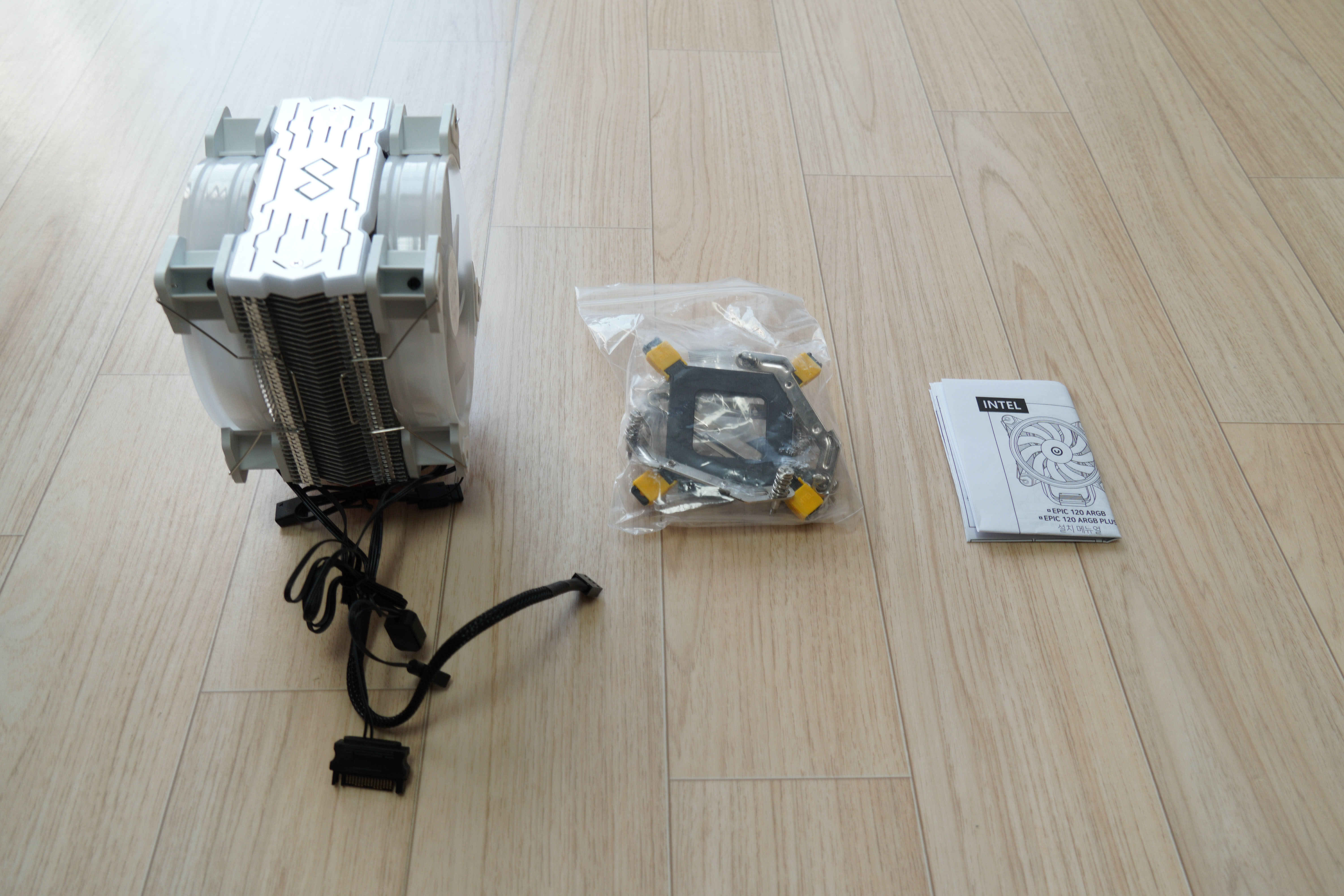 구성품은 쿨러, 각종 부속품, 설명서로 이루어져 있습니다.
