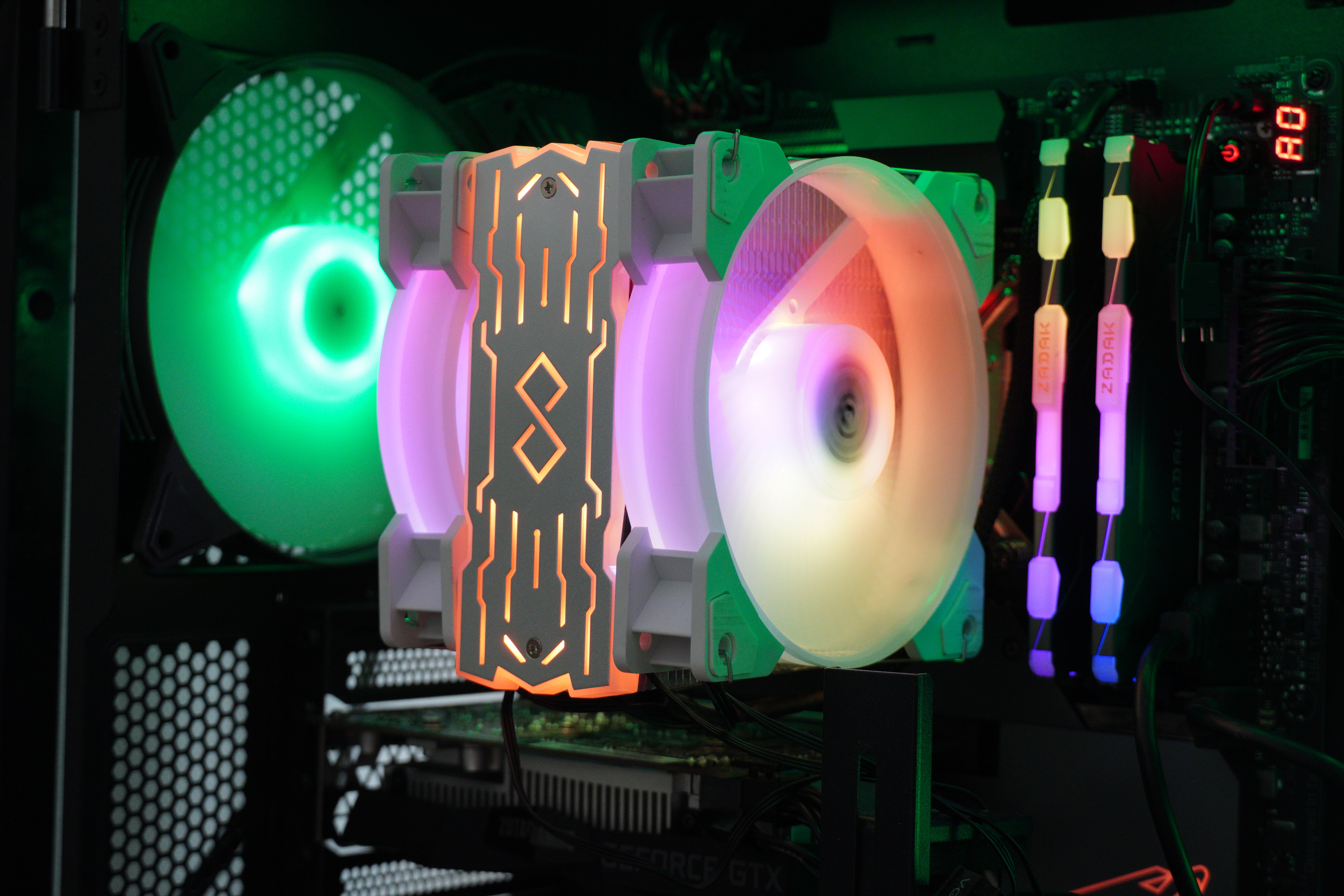 CPU 팬은 두 팬이 하나의 CPU 팬 단자에서 전원을 받는 방식이고, SATA를 연결할 경우 LED가 Cycle되며, ARGB 헤더를 연결하여 함께 연결할 경우, 메인보드의 LED 설정을 따라갑니다.