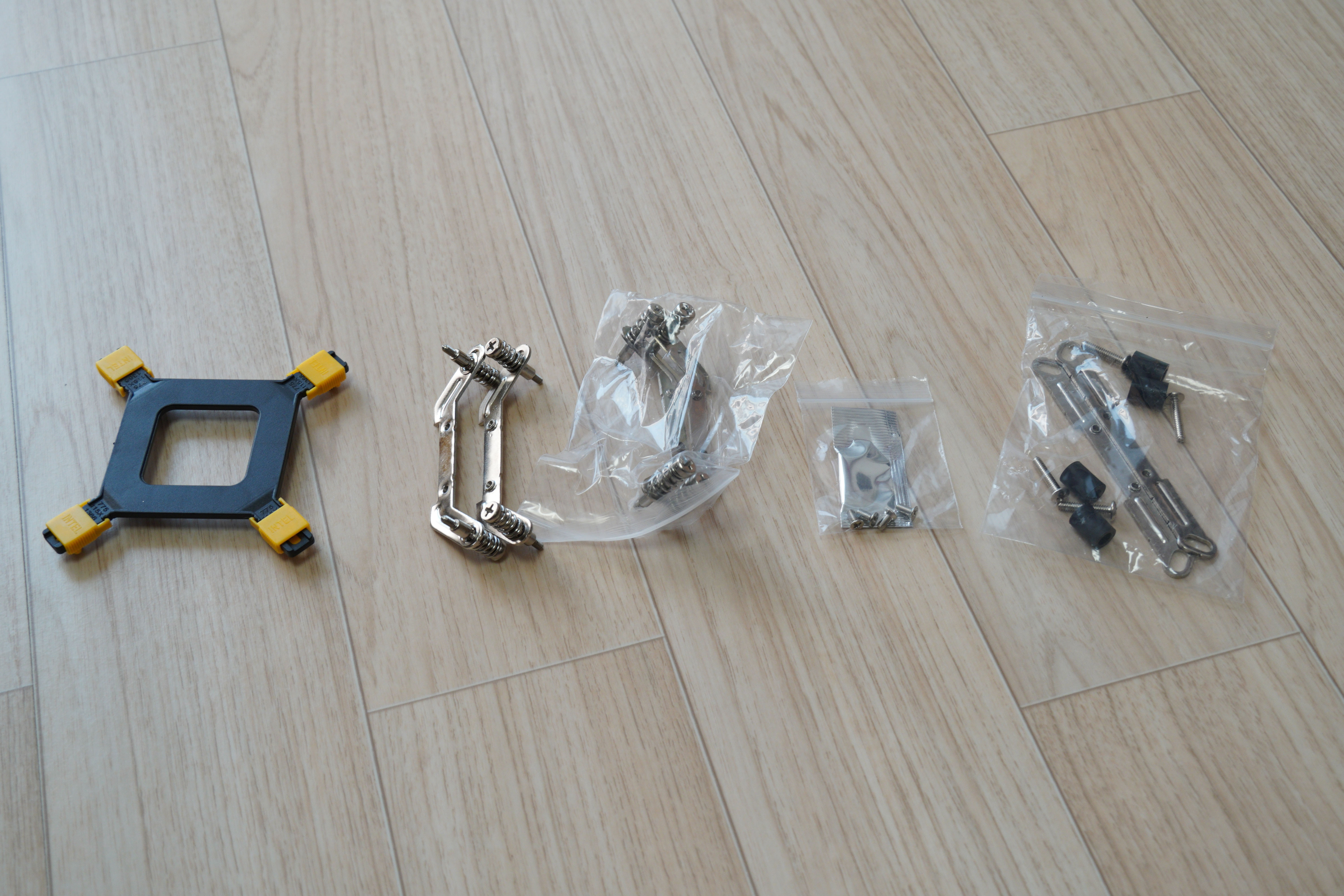 전체 부속을 살펴보면, 왼쪽부터 인텔 백플레이트, 인텔 LGA 115x 브라켓, 인텔 LGA 2011 브라켓, 써멀구리스와 브라켓 고정 핀, AMD 브라켓 세트입니다.