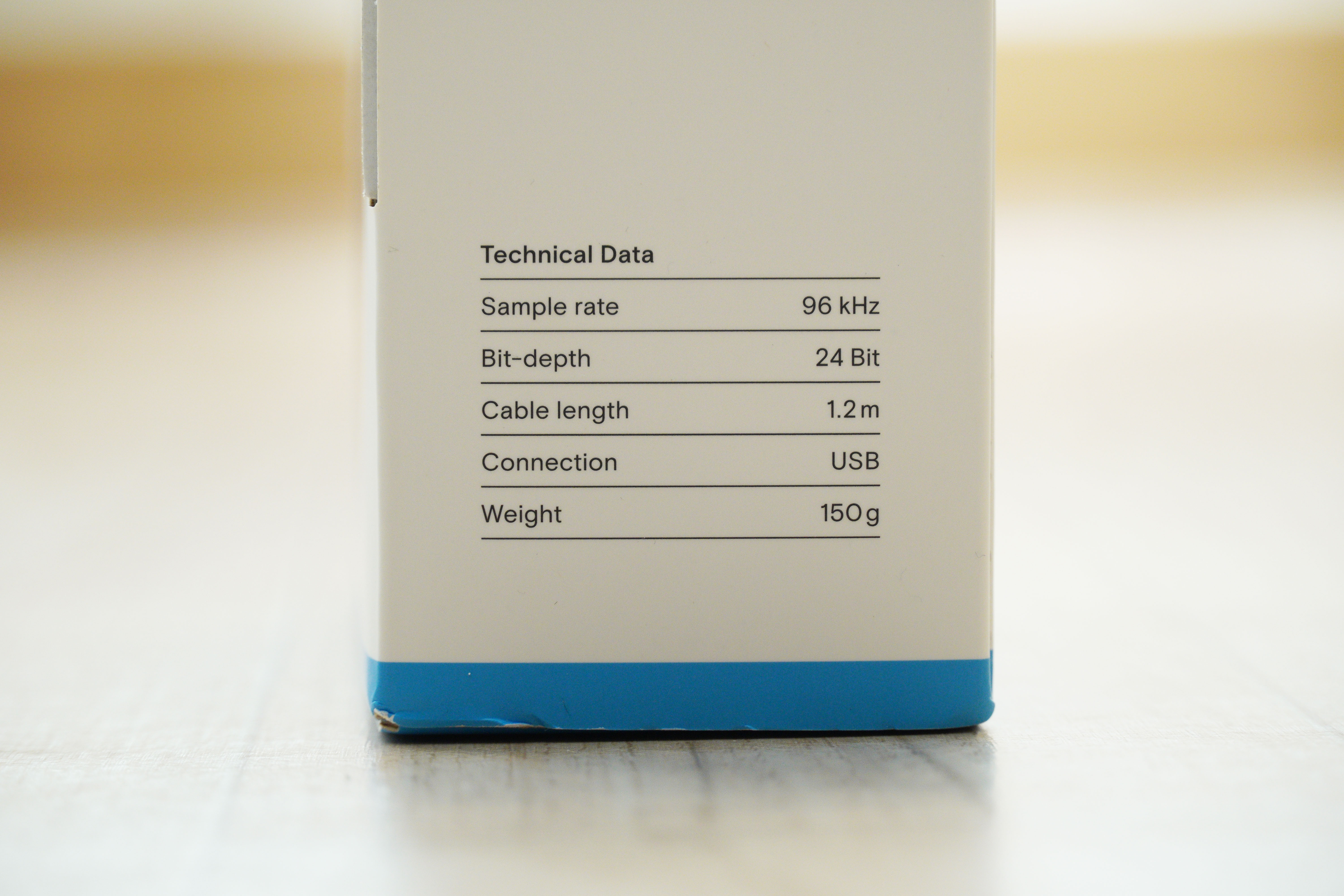 측면에는 사양이 간단하게 나와있습니다. 96kHz 24Bit의 고해상도 샘플레이트를 지원합니다. 무게는 150g으로 가벼운 편이고, 동봉된 케이블의 길이는 1.2m입니다.